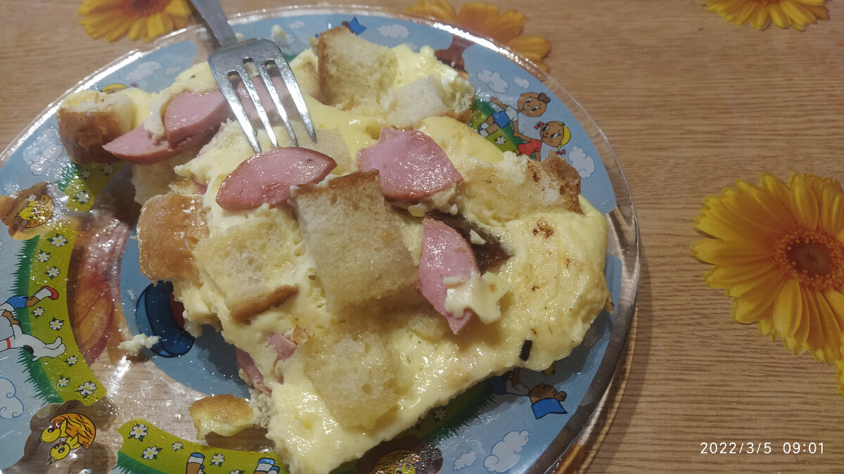 Доброе утро) сегодня мой ребенок захотел омлета. За одно я решила поделиться с вами рецептом нашего завтрака. Нам понадобится: Я очень люблю омлет с луком,поэтому половину мы будем делать для сына, а половину для себя. Половину луковицы порезать полукольцами и обжарить. Сосиски и хлеб порезать кубиками. Яйца взбить с майонезом. На половине сковороды выкладываем часть сосисок и хлеб, на второй половине - лук и остаток сосисок. Заливаем все яичной смесью и накрываем крышкой. Готовим на медленном огне 10-15 минут. Выкладываем на тарелки и приятного аппетита).