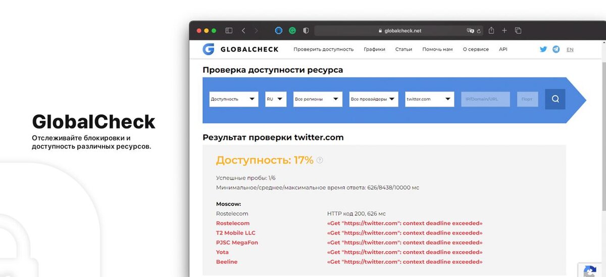 В настоящее время различные ресурсы блокируются настолько часто и быстро, что пользователи зачастую узнают об этом не из новостей, а непосредственно столкнувшись с проблемой. В подобной ситуации сложно сказать, что стало причиной неполадки, ведь не исключено, что вместо блокировки очередного сервиса произошел банальный локальный сбой у оператора сети. Чтобы подробнее узнать о неполадках, можно обратиться за помощью к сервису для мониторинга ресурсов и простоев GlobalCheck, который в реальном времени проанализирует доступность IP-адресов и доменов от различных интернет-провайдеров и предоставит статистику сложившейся ситуации. Если выбранный ресурс недоступен большинству операторов, то можно сделать вывод, что проблема имеет не локальный характер и, скорее всего, произошла блокировка со стороны сервиса или Роскомнадзора посредством ТСПУ — технических средств противодействия угрозам, которые обязаны устанавливать провайдеры по закону о «суверенном интернете» Наш телеграмм