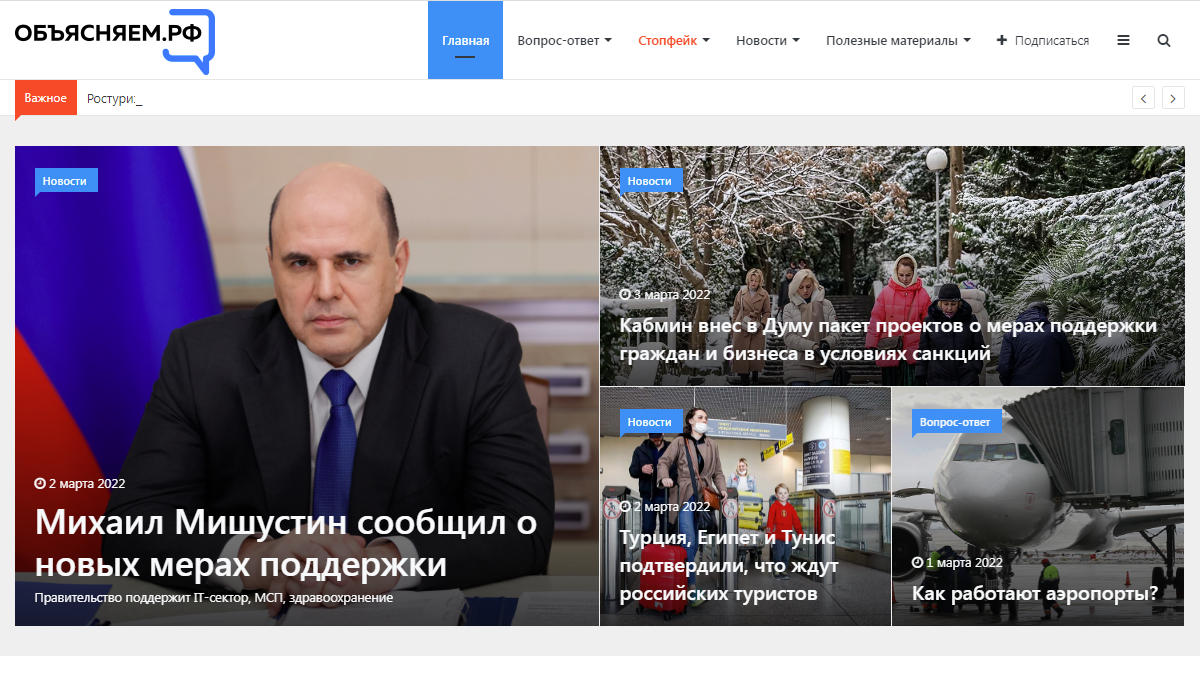 — Мы видим, что в сложившейся ситуации в социальных сетях и в СМИ размещается колоссальный поток информации, среди которой, к сожалению, содержится много фейков и слухов. Правительству важно донести до людей актуальную, достоверную информацию, поэтому председателем правительства было принято решение о запуске информационного ресурса «Объясняем.рф». Он будет работать по аналогии с уже известным порталом «Стопкоронавирус.рф», и новый портал станет источником проверенной, официальной, и что очень важно, оперативной информации, которая будет обновляться в режиме реального времени, — сказал он.