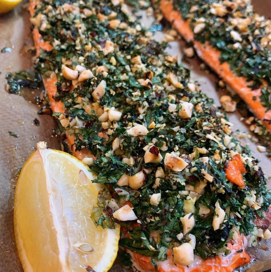 Накануне праздника хочется порадовать близким чем-то необычным. Как вам такой вариант? Вам понадобится: филе любой красной рыбы, например, нерки 600-700г листья петрушки, базилика 100г чеснок - 2 зубчика очищенный фундук 100г лимон растительное масло бумага (или коврик) для выпечки