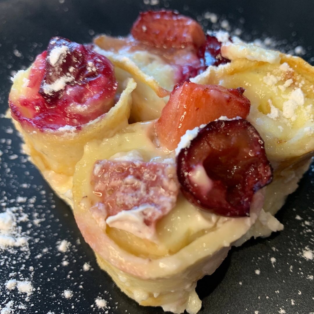 Свежие сплетни! Суббота - 6-й день Масленицы, который называется Золовкины посиделки. Девушки собирались поесть, посплетничать, подарить и, конечно, получить подарки. Вот и я приготовила подарок в виде блинной запеканки с бананами. Беру 6 тонких блинчиков (пеките по любому любимому рецепту), 2 банана, пачку ванильного творожка ~ 90 гр, замороженные ягоды вишни и клубники по вкусу, сливочное масло и сахарную пудру для подачи. Для заливки 75 гр сметаны (20%), 1,5 ст.л. сахара, 1 яйцо. У меня такие пропорции на форму 12*16 см. • Бананы очищаю, заворачиваю каждый в один блинчик и нарезаю ролл поперёк примерно на 6 кружочков. • Для заливки взбиваю все ингредиенты и покрываю содержимое формы. Сверху в произвольном порядке укладываю нарезанные ягоды 🍓 🍒 и отправляю запекаться в духовку на 30 мин. в разогретую до 180 градусов духовку. • Достаю запеканку, посыпаю сахарной пудрой и подаю🥰 #блины #блинчики #блины рецепт #запеканка #запеканка рецепт #простые рецепты #еда и рецепты #вкуснятина