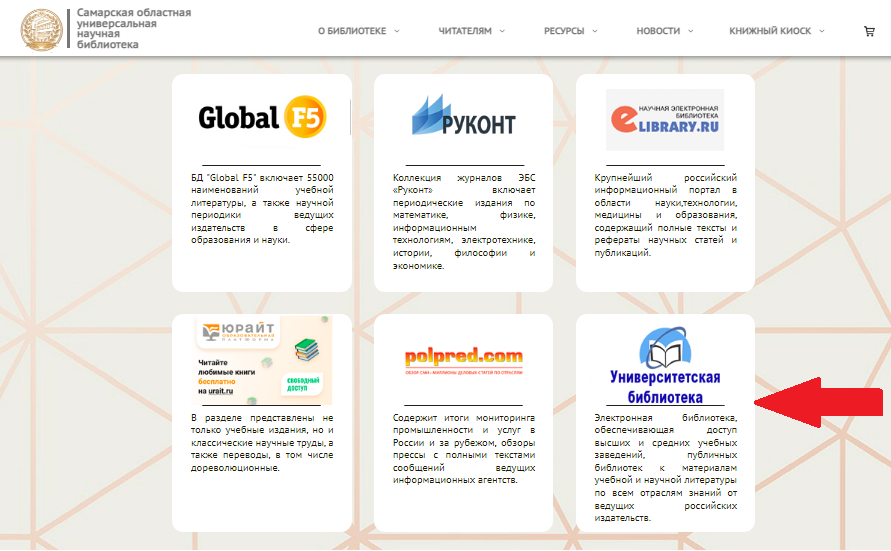 Самарская областная универсальная научная библиотека продолжает знакомить посетителей канала с ресурсами и возможностями современной библиотеки для дистанционного обслуживания населения региона. C первыми статьями вы можете ознакомиться по ссылкам: 1. Ресурсы и возможности современной библиотеки для дистанционного обслуживания населения региона 2. Электронная библиотека «Гребенникон» 3. Электронная база данных «East View» 4. Электронно-библиотечная система «БиблиоРоссика» 5. Библиотека ЛитРес: получаем бесплатный доступ 6. Зарубежные электронные ресурсы издательства «Springer Nature» 7. Электронно-библиотечная система "РУКОНТ" 8. Электронная библиотечная система «BOOK.RU» 9. Электронно-библиотечная система «Юрайт» 10. Электронно-библиотечная система «Znanium» Будучи студенткой вуза, постоянно обращаюсь к электронным библиотечным ресурсам, которые меня очень выручают. Не могу не поделиться своим опытом работы с электронной библиотечной системой (ЭБС) «Университетская библиотека online»,