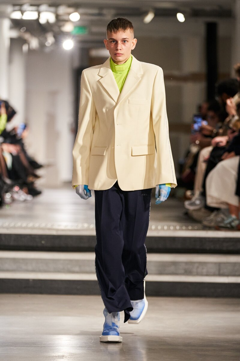 Первый офлайн-показ бренда прошёл в Париже Гурам Гвасалия презентовал новый проект, являющийся ответвлением Vetements Преданные поклонники творчества братьев Гвасалия увидели до боли знакомые «квадратные» силуэты с гипертрофированными плечами. Из новинок — укороченные пуховики, надетые поверх костюмов. Кроп-топы были лейтмотивом коллекции. Каст подчеркнул агендерность одежды, несмотря на её стереотипно мужественные черты. Надписи на кириллице в этот раз были на украинском языке. Модели продемонстрировали много кожаных аутфитов — костюмы, тренчи, куртки и брюки выполнены преимущественно из материалов черных и коричневых цветов. Культовые массивные ботинки представлены в кислотно-зеленом, красном и серебристом цвете. Обратила на себя внимание обувь, окрашенная в цвета ясного неба. Кстати, небесный принт — посвящение дизайнеру Вирджилу Абло А ещё Гурам Гвасалия «передал привет» Эминему и анонсировал, что у бренда появится линейка нижнего белья.