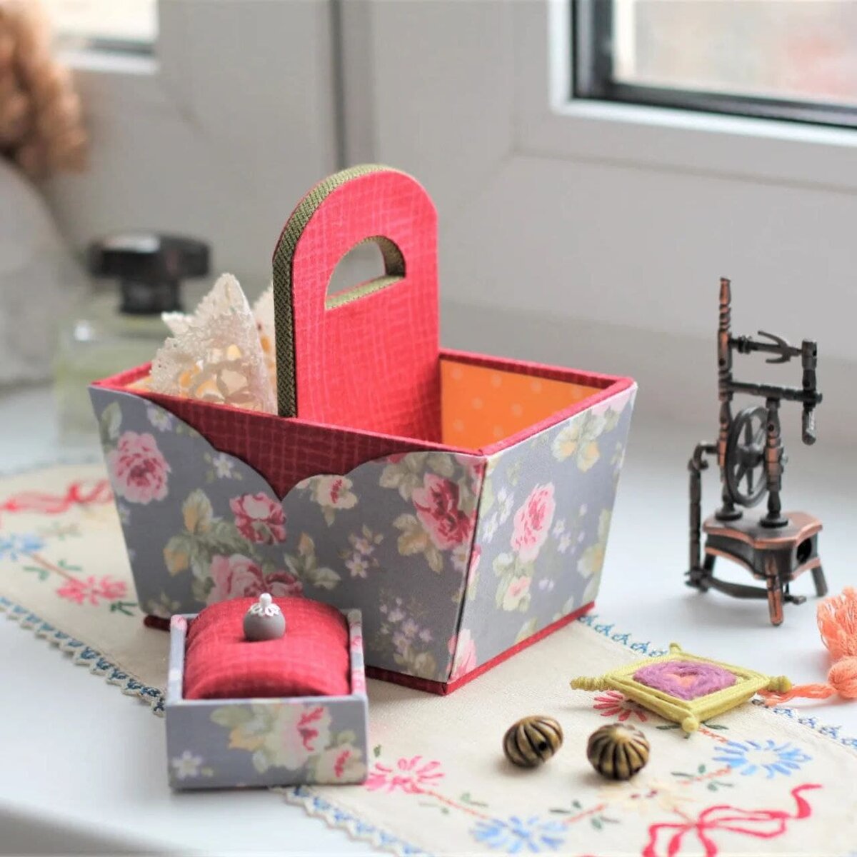 Работа на вынос! Это когда рукоделие переносится из мастерской в другую комнату. Например, раннее утро, все ещё сладко дрыхнут, а ты берёшь мааааленькую корзинку с нитками и пяльцами и, поскрипывая половицами перемещаешься на кухню. Варишь кофе и полностью погружаешься в работу. Или все дружно смотрят фильм, а ты сидишь в кресле и мирно вышиваешь. Одним глазом в экран, другим в работу. Тут опять же на помощь приходит небольшая коробочка или корзинка. Сложил всё необходимое и работаешь по-тихоньку. Так что мобильный рукодельный офис хорошая штука. Рекомендую!!! Очень удобно!!! А у вас есть такая помощница? Какая она?
