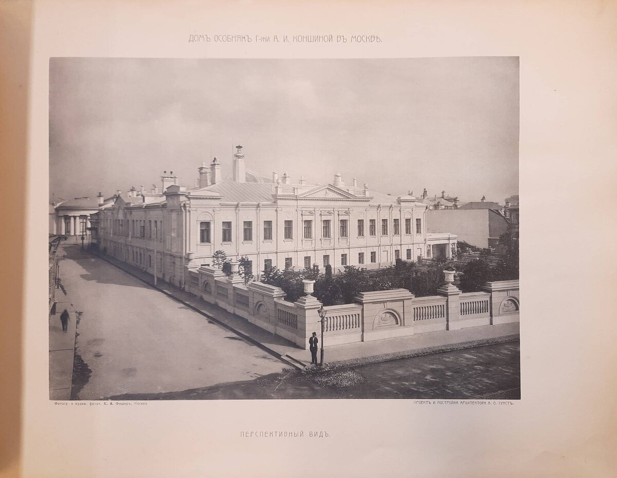 Друзья, делюсь с вами уникальным альбом с фотографиями особняка Александры Коншиной на Пречистенке. Обложка с тиснением. Написано "Дом-особняк г-жи А.И.Коншиной в Москве. Проект и постройка А.О.Гунст. 1910" Этот особняк много раз менял хозяев и перестраивался. Последняя переделка особняка была в 1908-1910 годах, когда Александра Коншина после смерти мужа и продав текстильную фабрику, решила переделать особняк с использованием всех последних технических достижений. Перестройка была поручена архитектору Анатолию Оттовичу Гунсту (1858-1919). По его проектам в Москве были построены особняки и доходные дома. Но самой значимой работой является именно этот особняк. Точно мне неизвестно, но предположу что именно Гунсту принадлежит идея создания этого альбома, так как фотографии показывают процесс создания особняка, фотографии интерьеров, а также фотопортрет самого архитектора на первой странице. Фотографии хозяйки особняка Александры Коншиной там нет. Далее идет групповой портрет без подписи.