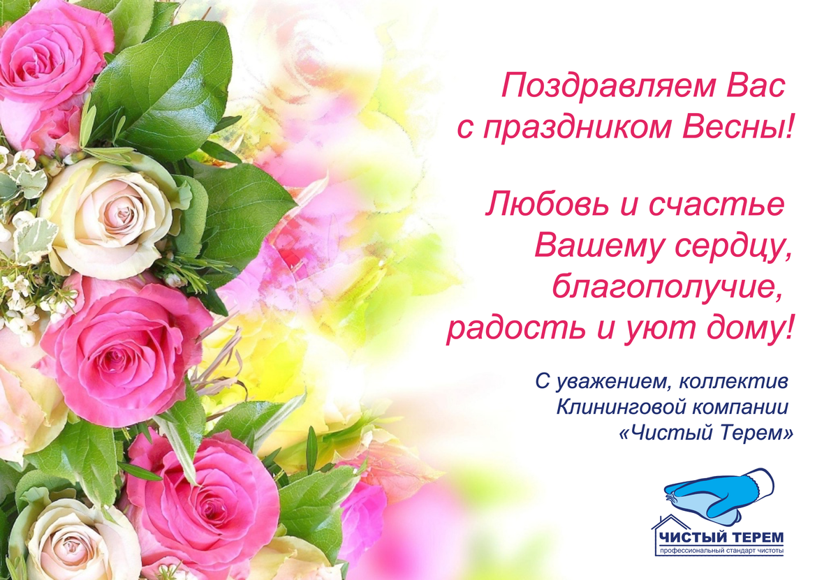 Милые дамы! 🌷От всего сердца поздравляем с наступающим прекрасным праздником Весны! 🌸Желаем, чтобы каждый день был наполнен счастьем, улыбками, приятными сюрпризами и радостными событиями! 🌼Пусть в жизни будет много помощников, которые экономят силы и дарят свободное время, чтобы его посвятить отдыху, любимым занятиям, себе и близким людям! Мы всегда к Вашим услугам по всем вопросам чистоты и порядка. ❤️С уважением, коллектив клининговой компании «Чистый Терем»