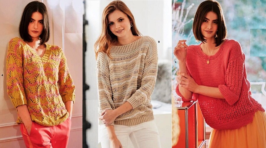 Пуловеры с разным вырезами ворота объединяет длина рукава три четверти. В двухцветном пуловере интересное сочетание ярких солнечных цветов. Легко запоминающийся ажурный узор и V-образный вырез горловины делает пуловер привлекательным. Элегантный и изысканный пуловер пастельных тонов из разряда "и в пир и в мир". Упрощенный фасон из прямоугольников компенсируется ажурными волнами узора. Весенний пуловер оттенка цветущей сакуры. Ажурные ромбы по рукавам и низу пуловера придают легкость и воздушность. Нежные модели из Sabrina №4 2022 Germany. Приглашаю подписаться на мой канал о вязании для нас и наших питомцев!