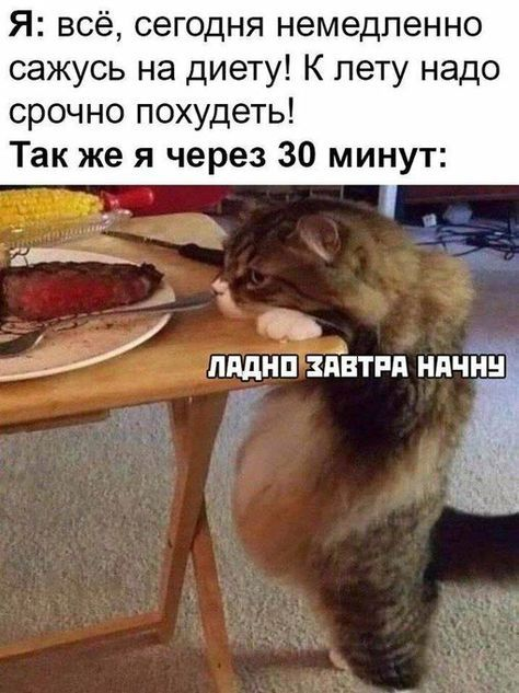 1. Кот и его диета Мем который может напомнит каждого кто хотел похудеть , но так и не смог начать , думаю нас таких много 2. Кошки и их породы для хозяев Каждый человек , который имеет в доме кота или кошку , скорее всего так и отвечал своим друзьям и гостям в доме 3. Любопытное фото спящего кота Думаю каждый человек задавался этим вопросом , но мало кто получал на него ответ. На самом деле довольно любопытно наблюдать за таким котиком 4. Запрет для кота Обычное явление для кота , который уронил цветок либо напакостил в комнате 5. Каждый кот увидев себя в интернете :) Мысли кота , который хочет кушать и ищет любой повод для этого 6. Сонного кота лучше не трогать Если кот тебя разбудит то это нормально , а если вы разбудили кота , то это не к добру 7. Каждый котик в своих снах В каждом коте есть свой герой! 8. Голодный кот Голодного кота ни что не остановит , он хуже любого зверя 9. Обычное поведение ребёнка в гостях Мысли каждого ребёнка , который пошёл в гости к друзьям родителей