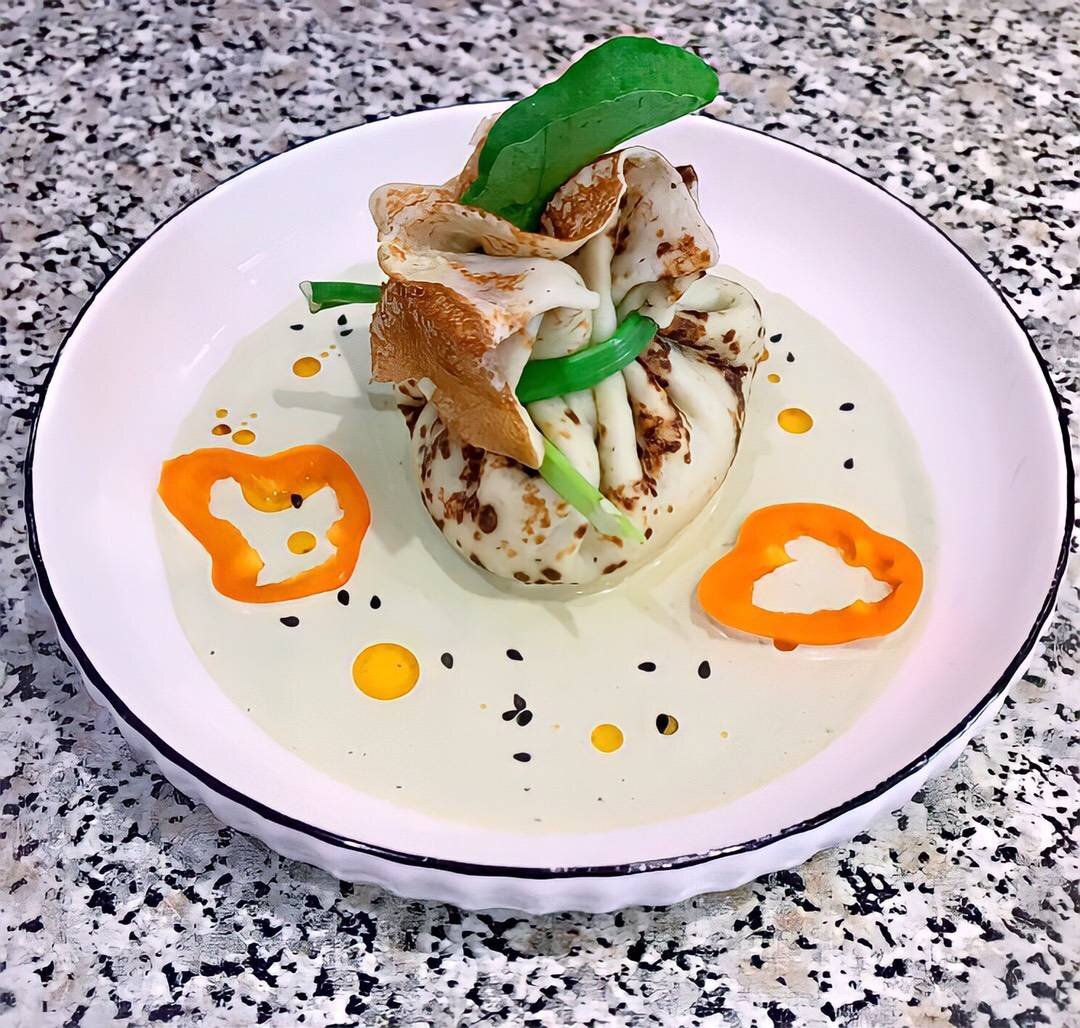 Ингредиенты: Для теста:, кефир, молоко, яйцо, мука, растительное масло, разрыхлитель, сахар, соль, Для начинки:, яйцо, помидоры вяленые в масле, Для соуса:, сливки 20%, соус песто, Для украшения:, зелень, лук перо Способ приготовления: Все ингредиенты для теста соединить и выпекать блины. Затем варим яйцо пашот, как вам нравиться. Дальше для соуса соединить все ингредиенты в блендере. На блин кладём яйцо пашот, вяленый помидор. Затем блин формируем в виде мешочка. Блин завязать аккуратно зелёным луком. Готовый блинный мешочек кладём на блюдо. Полить соусом. Затем украсить зеленью и полить маслом от вяленых помидор. Подавать 👈порционно.