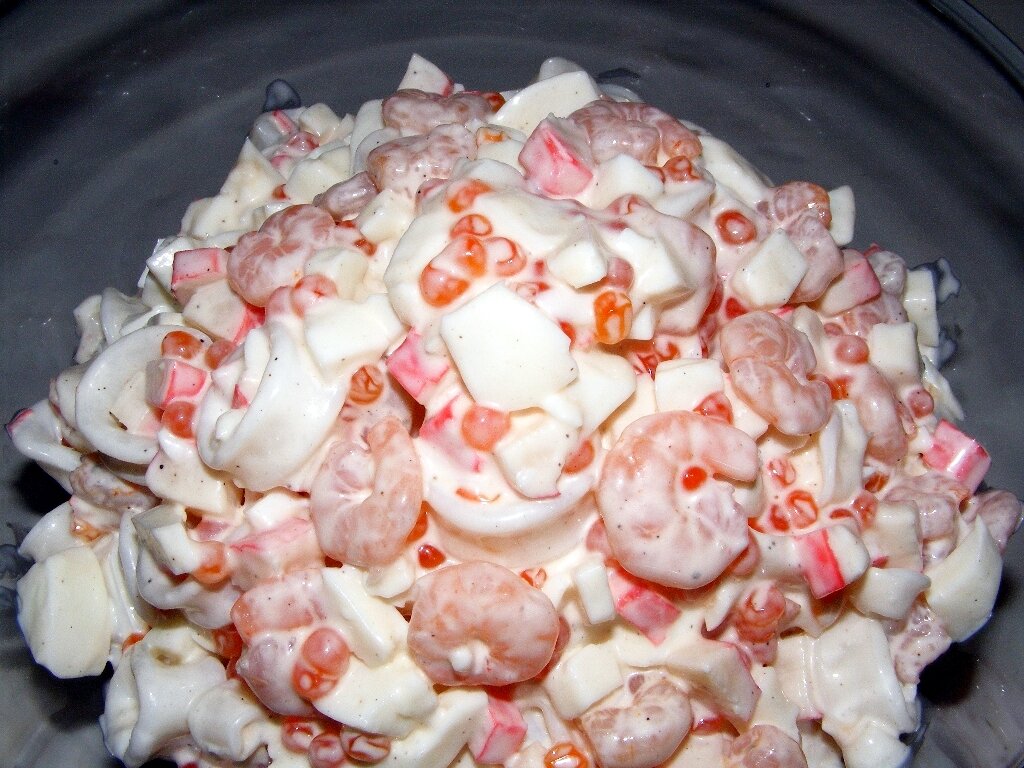 5. Теперь добавляем пару столовых ложек майонеза, перемешиваем, а потом добавляем красную икру.
