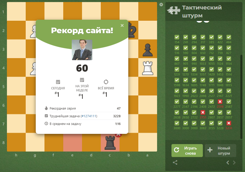 Вчера было знаменательное для меня событие: был пробит порог в 3000 по решению задач на chess.com. Сегодня же установлен новый рекорд в тактическом штурме 60 решённых задач. До этого рекорд составлял 58 задач и держался чуть меньше года (установлен 20 марта 2021 года). Трудности возникли в следующих позициях: 1. Рейтинг 2519 В который раз замечаю, что при повторном решении после завершения тактического штурма решение большинства задач находятся очень быстро. Эта задача как раз относится именно к этому классу задач. Сначала приведу своё ошибочное решение: