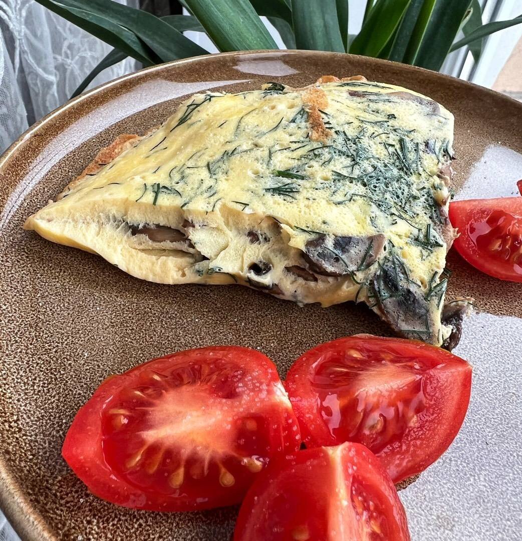 Ингредиенты: крупных куриных яйца, шампиньонов, укропа, сметаны 20%, молока 3,2%, Соль, Растительное масло Способ приготовления: Грибы нарезать пластинками и обжарить на 1 ст л растительного масла до выпаривания жидкости. Яйца взбить с молоком, добавить сметану и хорошо все взбить еще раз. Лучше использовать блендер. Нарубить укроп, всыпать в яичную смесь, все посолить и вылить к грибам На самом медленном огне под крышкой держать около 5 минут, выключить огонь и не поднимать крышку еще 3 минуты. Далее омлет смазать сыром и накрыть половинкой.