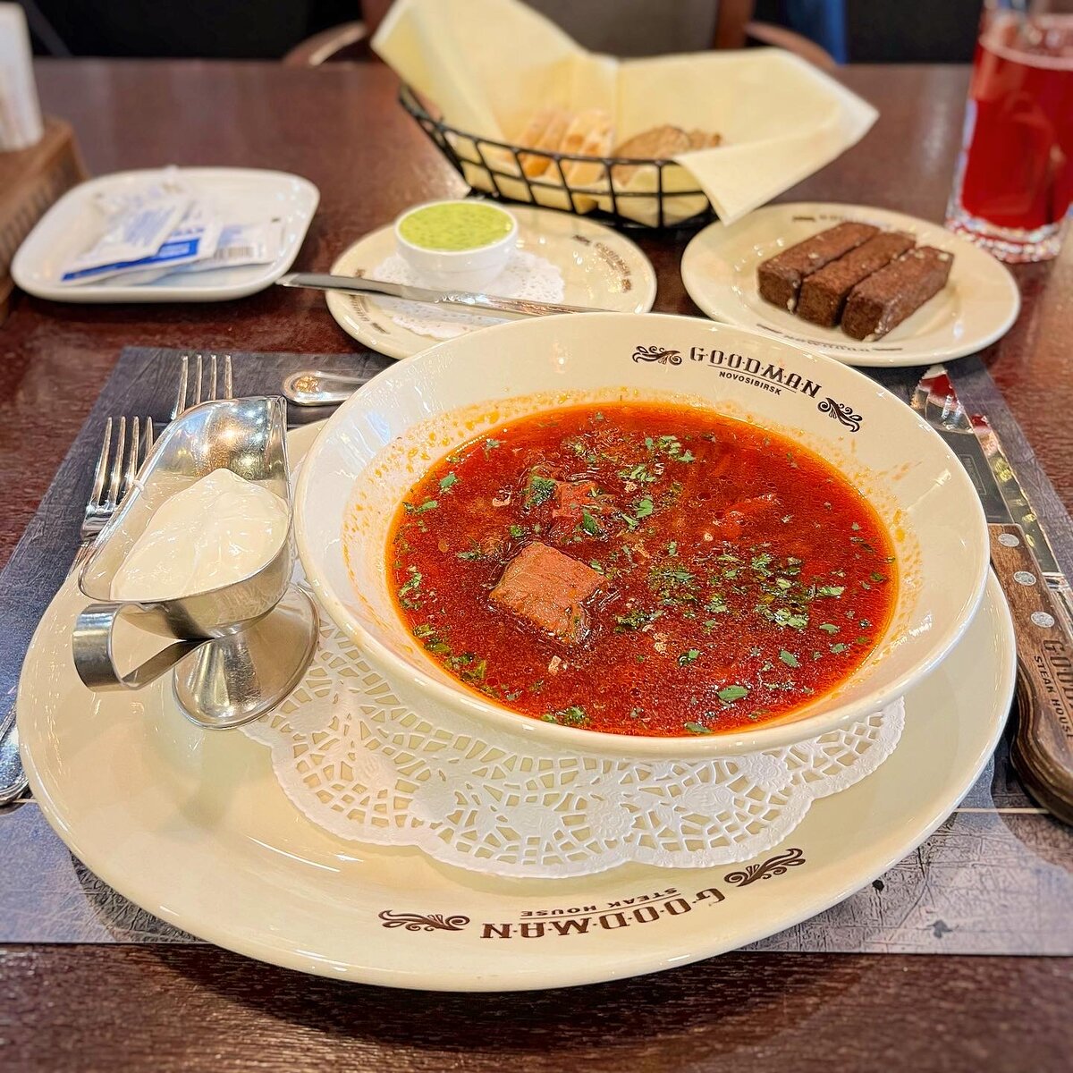 Волею случая отобедал в стейк-хаусе GOODMAN. Публика здесь большей частью постоянная. Многие здороваются с официантами как с добрыми друзьями и жмут им руки. Часто здесь можно встретить и сетевиков, и тех, чьи фамилии называть — себе дороже. Меню ланча здесь есть и оно не меняется годами. Видимо, посетители любят и ценят постоянство. Стоимость набора суп + горячее блюдо составляет 820 ₽. К набору так же идёт напиток. В качестве комплемента дают хлебную тарелку с двумя видами хлеба и масло. Борщ. Подаётся со сметаной и чесночными гренками. Такие обычно к пиву идут. Борщ хороший, наваристый. Овощи нарезаны соломкой, за исключением картошки. Мясо присутствует — два больших куска стейка прожарки medium well. Сочные, с ароматом дымка. Колбаски собственного изготовления. К колбаскам взял на гарнир картофельное пюре с сыром рокфор. Колбаски изготовлены из мраморной говядины и подаются с соусом барбекю. Несмотря на небольшой диаметр, колбаски сочные. Единственно, ожидал, что будет рублен