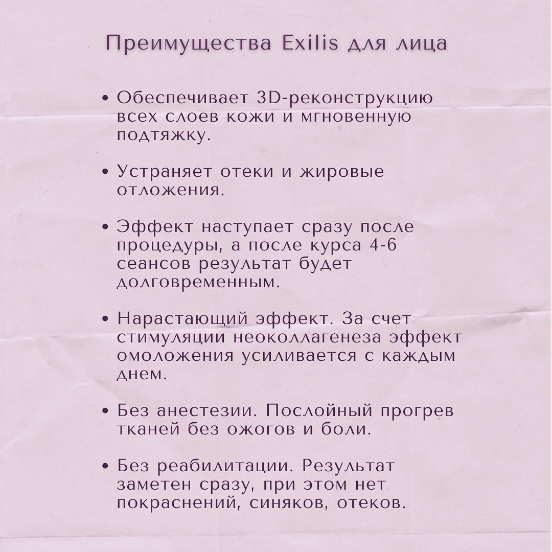 EXILIS – это инновационная технология радиочастот для омоложения лица и коррекции фигуры. Механизм действия основан на синергичном воздействии высокочастотных радиоволн, ультразвука и контролируемых тепловых импульсов, что обеспечивает мощный эффект безоперационной липосакции и лифтинга. Уменьшаются объемы жировых отложений, подтягивается кожа, фигура становится стройной. ⠀ Какие преимущества у процедуры? ▫️гладкая и упругая кожа; ▫️антивозрастной эффект; ▫️уменьшение морщин вокруг рта и глаз, на лбу и в области шеи; ▫️потрясающие результаты на вялых участках тела; ▫️эффект от воздействия заметен сразу же; ▫️омоложение кожи за счёт стимуляции выработки коллагена; ▫️прогрессирующий накопительный эффект; ▫️отсутствуют побочные эффекты. ⠀ ❕Процедура абсолютно безболезненная, у неё нет реабилитационного периода. Вы получаете максимальный эффект в сжатые сроки. ⠀ После процедуры вы сразу увидите эффект, но рекомендуем делать её курсом, поскольку у Exilis прогрессирующий накопительный эфф