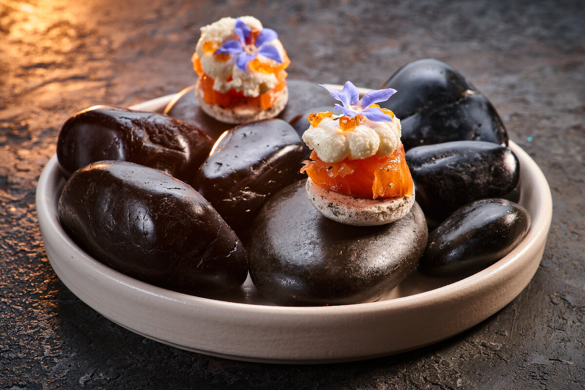 - Лосось слабой соли со сливочным муссом из хрена и печеньем из водорослей
