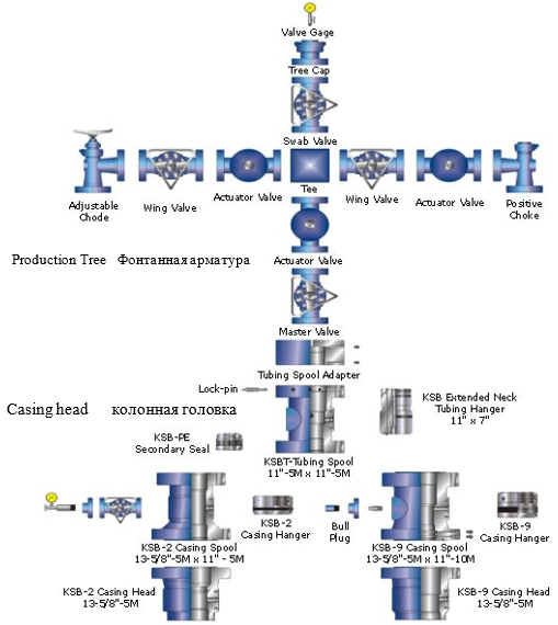 Typical Production Tree. Обычная фонтанная арматура (крестовая) Production Tree Фонтанная арматура Valve gage контрольная задвижка Tree cap колпак фонтанной арматуры Swab valve проходная задвижка Wing valve выкидная задвижка Actuator valve регулируемый клапан Tee тройник Adjustable choke регулируемый штуцер Positive choke нерегулируемый штуцер Master valve главная (коренная) задвижка Lock-pin стопорный палец Tubing spool adapter планшайба (для подвески НКТ) tubing spool катушка подвески НКТ (катушка планшайбы) extended neck tubing hanger расширяющаяся муфта подвески НКТ(переводник подвески НКТ) secondary seal вторичное уплотнение Casing head колонная головка Casing hanger подвеска обсадной колонны (сухарь) Bull plug коническая пробка Casing spool переходная катушка Casing head колонная головка Gate valve запорная задвижка Gate затвор (запорный элемент) Body корпус Handle штурвал Bonnet крышка Bonnet cap стакан (колпак) крышки Stem шток Stem padking сальник (уплотнение) штока Metal s