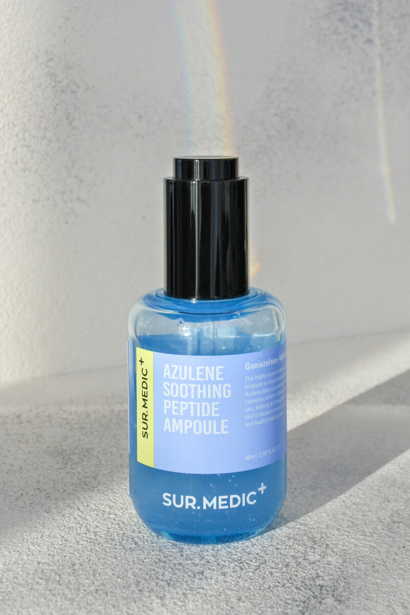 💙Ещё одно замечательное средство с азуленом от бренда NEOGEN SUR.MEDIC+ AZULENE SOOTHING PEPTIDE AMPOULE💙 ⠀ 💙Ампула - это высококонцентрированная сыворотка, с высоким содержанием активных компонентов. ⠀ 💙Кроме голубых капсул с азуленом и пептидами, в сыворотке есть белые капсулы с керамидами. Вместе капсулы эффективно успокаивают кожу, восстанавливают и укрепляют защитный барьер, улучшают эластичность кожи. ⠀ 💙У ампулы очень большой объем 80мл. Удобная помпа с пипеткой. Аромат ненавязчивый, лечебными травами. Текстура интересная, густая, с маленькими голубыми шариками и ещё меньше белыми. Они быстро лопуются и растворяются на коже. Распределяется сыворотка хорошо. Впитывается полностью, не оставляя при этом липкости и пленки на лице. ⠀ 💙Пользуюсь ампулой почти 2 месяца и использовала половину. Наношу на лицо, шею и зону декольте, утром и вечером после умывания. Сыворотка отлично увлажняет, успокаивает, укрепляет кожу (сосудистая сеточка возле носа стала менее заметна). Ампула не