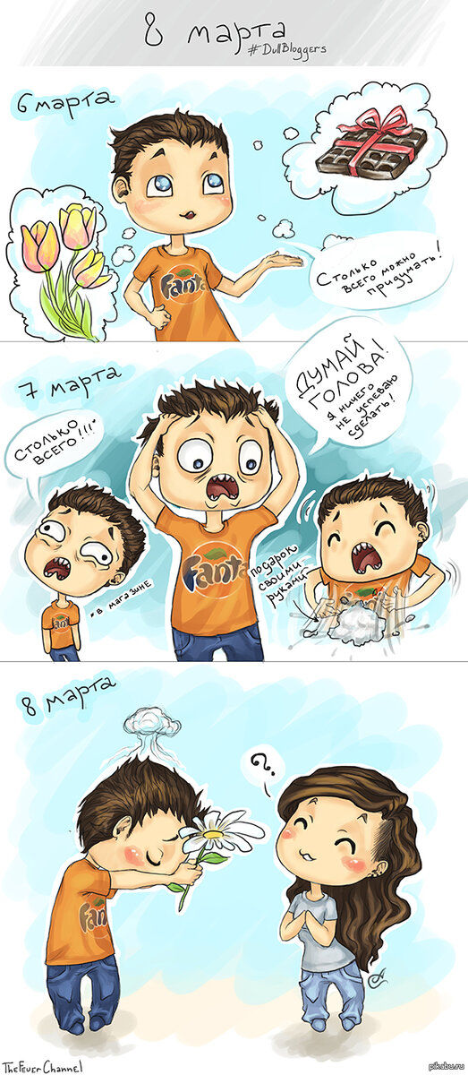 Привет, дорогой друг! До Международного женского дня остается пару дней, а это значит, что парням уже точно стоит суетиться, если они хотят успеть подготовить #подарки своей второй половинке. А в качестве стимула я подготовил смешные #комиксы про ситуации, связанные с этим весенним праздником. Чем раньше ты начинаешь думать о подарке, тем больше перед тобой открывается возможностей. То есть предварительная подготовка абсолютно точно снижает стресс. Однако, как показывает комикс от авторов The Feuer Channel, справиться с ленью бывает сложно, даже когда ты знаешь о последствиях своей нерасторопности. В отношении подарков разные люди придерживаются разных подходов. Кто-то считает, что в #праздник нужно подключать все романтическое воображение, но есть также и те, кто придерживается более прагматичного подхода. Например, как в веб-комиксе «Сова — эффективный менеджер». Как я уже говорил, чем раньше начинаешь задумываться о подарках, тем меньше нервов тратишь накануне праздника. Однако, под
