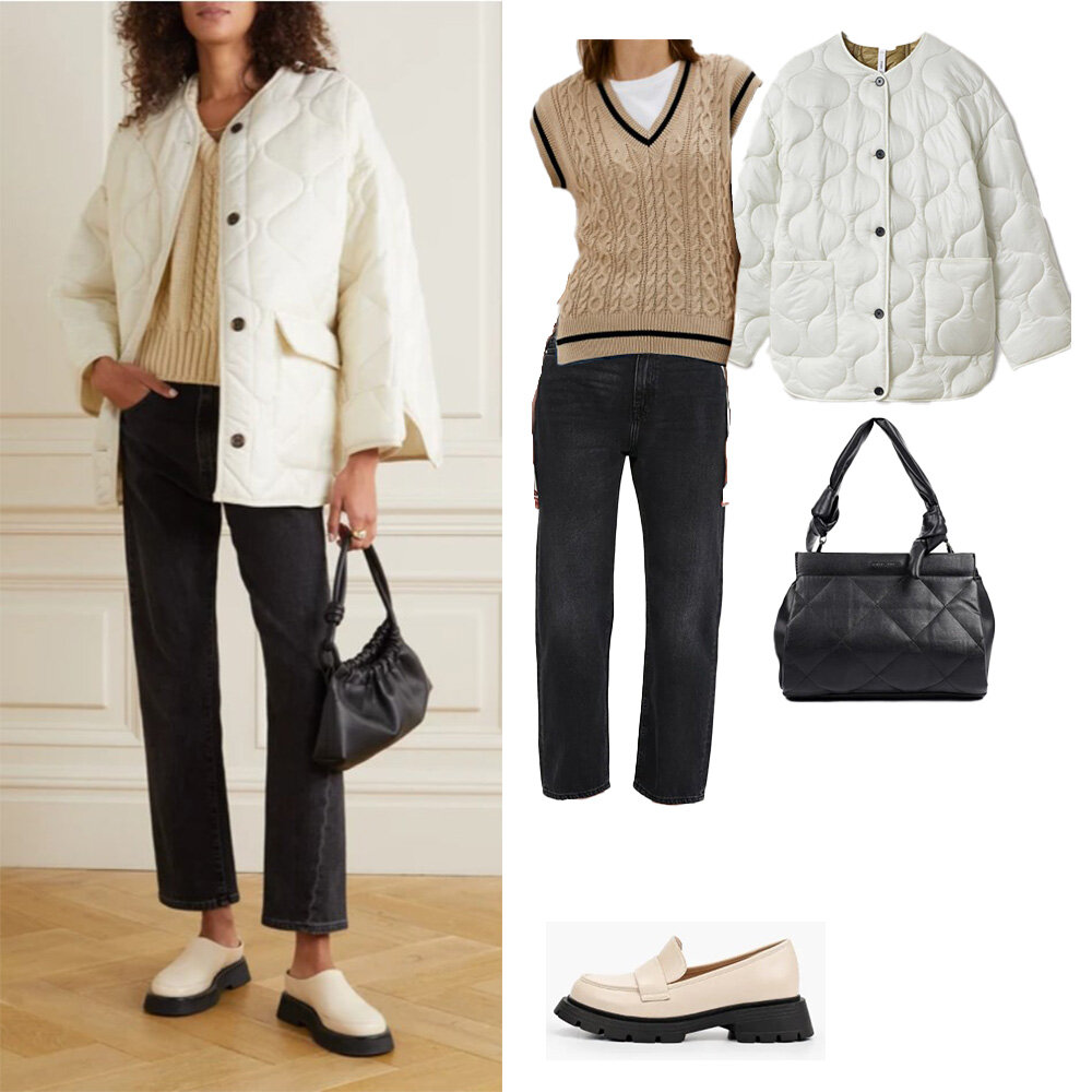 Весна началась... и пока закончилась. Но я буду ее возвращать хотя бы у себя в статьях, показывая стильные идеи на теплое время года. Сегодня три разных люксовых комплекта и их аналоги, собранные на Ламоде. Вещи для создания похожих образов показаны с ценами и ссылками Комплект 1. Комфортный, при этом стильный образ. Жилет в нем выступает в роли первого слоя. При желании под него можно надеть водолазку, футболку или рубашку. Куртка здесь от FRANKIE SHOP и стоит £187.50 Нам нужно: 1. Куртка утепленная Mango за 8 999 ₽ 2. Жилет Тrendyol 2 699 ₽ (было 3 899 3. Джинсы Noisy May за 2 690 ₽ (было 4 900) 4. Сумка david jones за 3 299 ₽ 5. Лоферы vitacci за 7 990 ₽ Комплект 2. Блейзер красивого фисташкового цвета замечательно смотрится с черными брюками. Обращаю внимание, что рубашка+ блейзер- приевшееся сочетание, а вот с майкой - свежее. Блейзер здесь от ACNE STUDIOS за £587.50 Для создания аналогичного образа нам понадобится: Брюки Antiga за 3 299 ₽ (было 4 599) 2. Майка Befree за 719