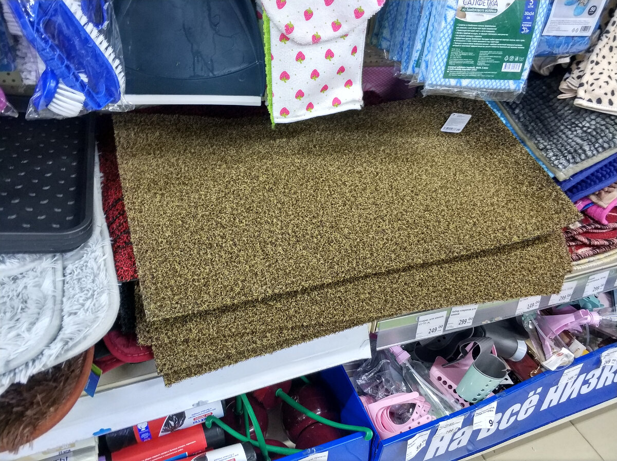 Приветствую, уважаемые! Ну, что, новинки для кухни опять появились и, по-видимому, коллекциями. Как всегда ФиксПрайс возит товары частями, из каждого завоза будут новые изделия. Я буду стараться так же своевременно показывать их. Начну сегодня все же с товаров для дома. Тут появились интересные коврики-травки. Толщина вот такая, крупно показываю. Кстати, напишу для тех, кто боится, что выстирать тяжело будет... У меня на даче есть аналогичная. В ФиксПрайсе такие я не видела раньше, покупала в другом магазине. По ощущениям - именно такая же. Пыль хорошо отделяется от обуви, легко вытряхается полностью. Вымывается так же легко под струей воды. Испльзую только на входе в дом. В городских условиях как мыть - не знаю, потому что в стиральную машину такое не засуну, в ванной тоже. На улице мыть на даче легко, удобно и быстро стекает, сохнет. Этикетку тоже сфотографировала. Но нижняя сторона скользкая. Сразу говорю, плохо держится, по полу постоянно соскальзывает, если не закреплять. Я одно
