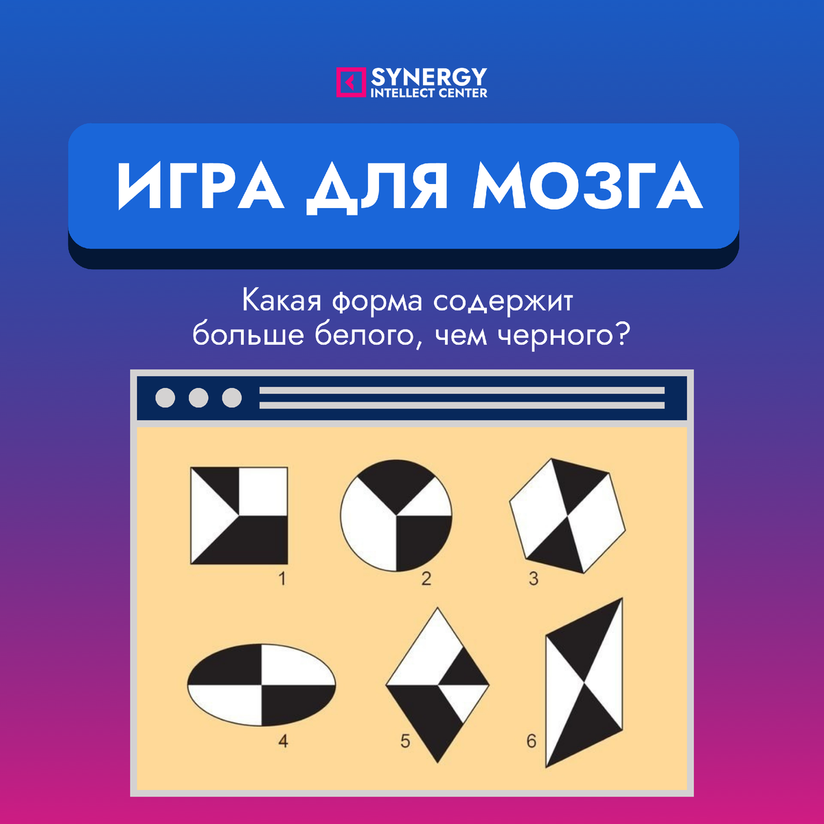 🧠 Разминаем мозг вместе с Центром Интеллекта «Синергия»! На этот раз приготовили задачку для развития пространственного мышления. Вопрос такой ☝️: какая форма (1-6) содержит больше белого, чем черного Свои ответы пишите в комментариях 👇