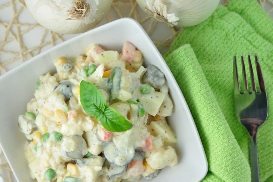 Ингредиенты: Приготовление: 1. Промыть цветную капусту, разобрать на соцветья, готовим её на пару 15 минут. 2. Пока готовится капуста, в тарелке перемешиваем размороженные овощи, мелко нарезанные яйца, лук и солёные огурцы. Добавляем греческий йогурт, горчицу и соль по вкусу. 3. После того как капуста будет готова, мелко её нарезаем и также добавляем в салат. Салат подаём холодным, можно подавать с любим гарниром. Приятного аппетита!