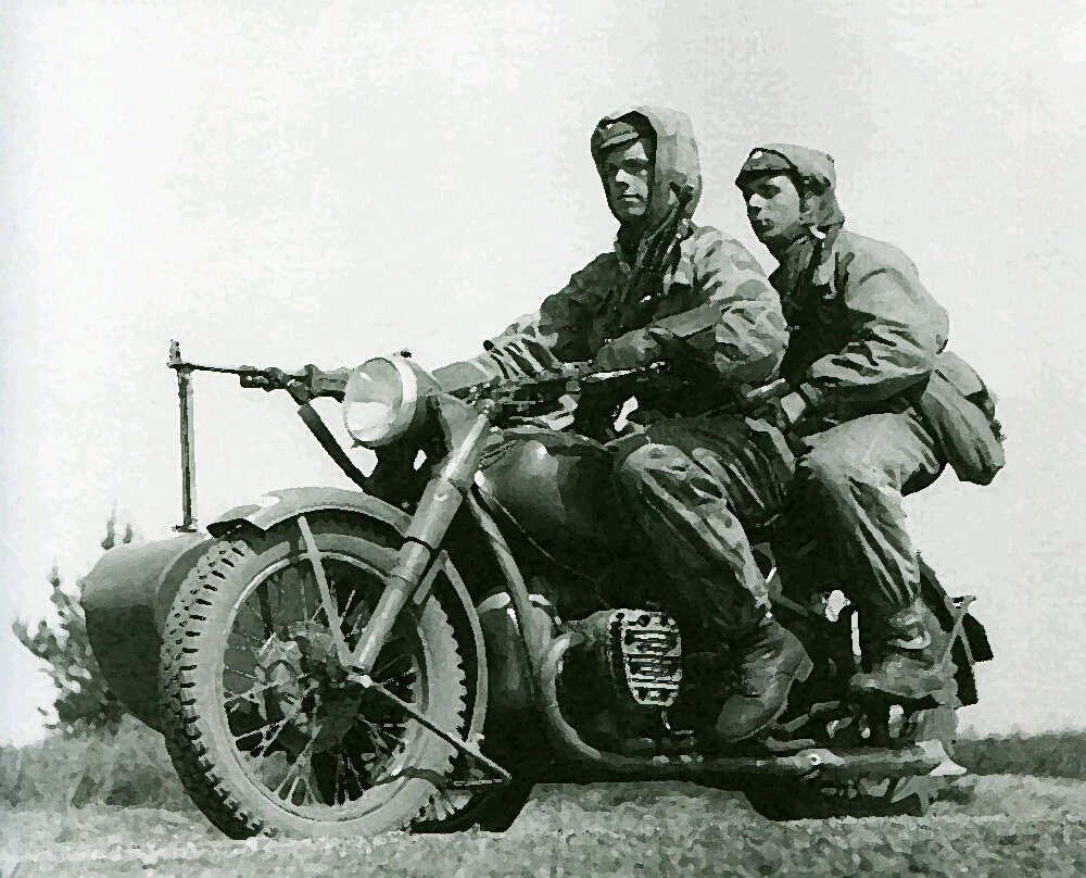 Полеты-полетами, а служба-службой. Заступаю я с товарищами в караул. Посты выставляются на стоянку самолетов и в ТЭЧ (технико-эксплуатационная часть). Вот в ТЭЧ мы с Юркой и попали. Что такое ТЭЧ? Это закрытый ангар, большая площадка перед ним с парой самолетов, несколько автомобилей, пара небольших домиков технического состава и будка-вагончик. Всё огорожено забором с колючей проволокой. Всё как правило закрыто и опечатано. Скучное место, нас ожидало унылое времяпрепровождение. Только погода радовала. Сменили предыдущих караульных. Возле ангара неожиданно обнаружили настоящий мотоцикл с коляской. Это был легендарный «Днепр», повышенной проходимости, с приводом на колесо коляски. Вот это подарок! Видимо кто-то из технарей оставил и не побоялся. Ну что ж, скучного караула сегодня не будет. Мы же не можем оставить всё, как есть. Был вечер, уже темнело. Приступили к изучению аппарата. Бензин в баке был, ключа зажигания, естественно, не было. Раскрутили коробку, в которой установлен замок