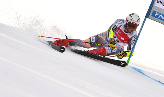 Первым из австрийцев уходит на трассу Макс Франц. Он медленнее по скорости наверху, проигрывает 40 сотых на второй отсечке. Дальше он идет на третье время с отставанием в полсекунды, остается в красной зоне и финиширует третьим, проиграл 87 сотых американцу.
