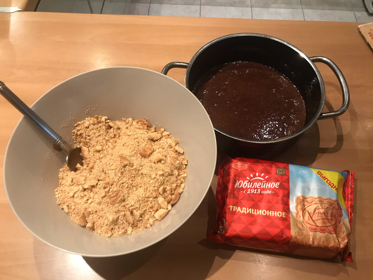 Вкус детства. Шоколадная «колбаса». Взять 500 гр печенья ( какое нравиться). Я люблю «юбилейное» печенье. Прокатать скалкой до крошки. Можно ещё добавить 1 стакан дробленых грецких орехов. В кастрюле смешать 1 стакан сахара с 3 -ям столовыми ложками какао, положить 200 гр сливочного масла и влить 1/3 стакана молока. Поставить на огонь, довести до кипения ,все время помешивая. Снять с огня и вбить 1 яйцо . Надо быстро мешать, чтобы яйцо не сварилось. Добавить ещё 2 столовые ложки рома (коньяка, ликера..) Влить смесь в печенье и перемешать. Разделить на 2 части. Положить на фольгу. Скатать в колбаски и в морозильную камеру. Минимум на 2 часа. Далее можно хранить в холодильнике или в морозильной камере. Приятного аппетита!