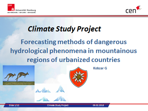 Objective The aim of the work is to analyze the current trend of the frequency of occurrence of dangerous hydrological phenomena in the mountain regions of Europe and Australia to identify the causes of possible errors in forecasting. To give recommendations on optimization of forecasts and study ways to reduce the capacity of dangerous hydrological phenomena. Types of floods in mountainous areas: - Flash floods - River floods - Ice jam flooding - Urban floods - Engineering issues Tasks and methods: - Differences and common features in the processes of formation of floods in the mountain regions of Europe and Australia were identified with using comparative method, statistical method, historical method, literary method, cartographic method, aerial photography, space method (analysis of satellite images), analysis and synthesis method. - The causes of inaccuracies in forecasting hazardous water events in mountain areas were analyzed and provide recommendations for correcting forecastin