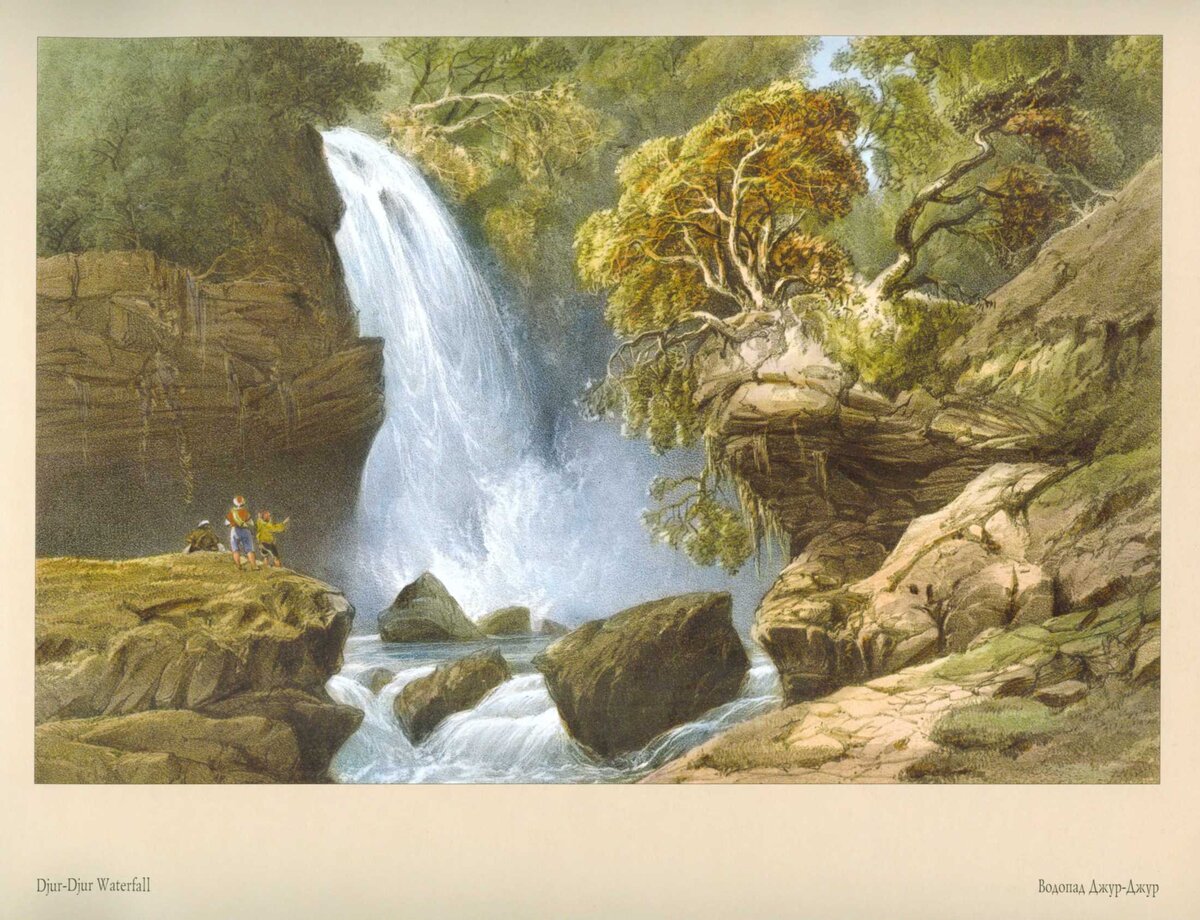 Рассказывает Монтандон и о водопаде: «Пробежав несколько туазов под сильным уклоном, вся вода Улу-Узеня падает почти отвесно с высоты более 50 футов. Иные струйки, отделившись, рассыпаются капельками по ковру изо мха и плюща, покрывающими часть скалы, и снова объединяются с основным потоком, попадая в глубокое вместилище, выдолбленное в скале водой. Как ни странно, но еще три года назад это место, – бесспорно, прекраснейшее в своем роде украшение здешних краев, – было известно только татарам, и лишь случайно его обнаружил господин Ланг, владелец этих земель». Что касается «господина Ланга», с ним у Монтандона были особые счеты, ведь импозантный француз увел у Ланга жену Июстинию. Бурный роман путешественника и местной красавицы стал одной из главных сплетен столицы Таврической губернии – Симферополя. И можно сказать, что именно благодаря этой романтической истории нам и стало известно о том, каким был Джур-Джур много лет назад.