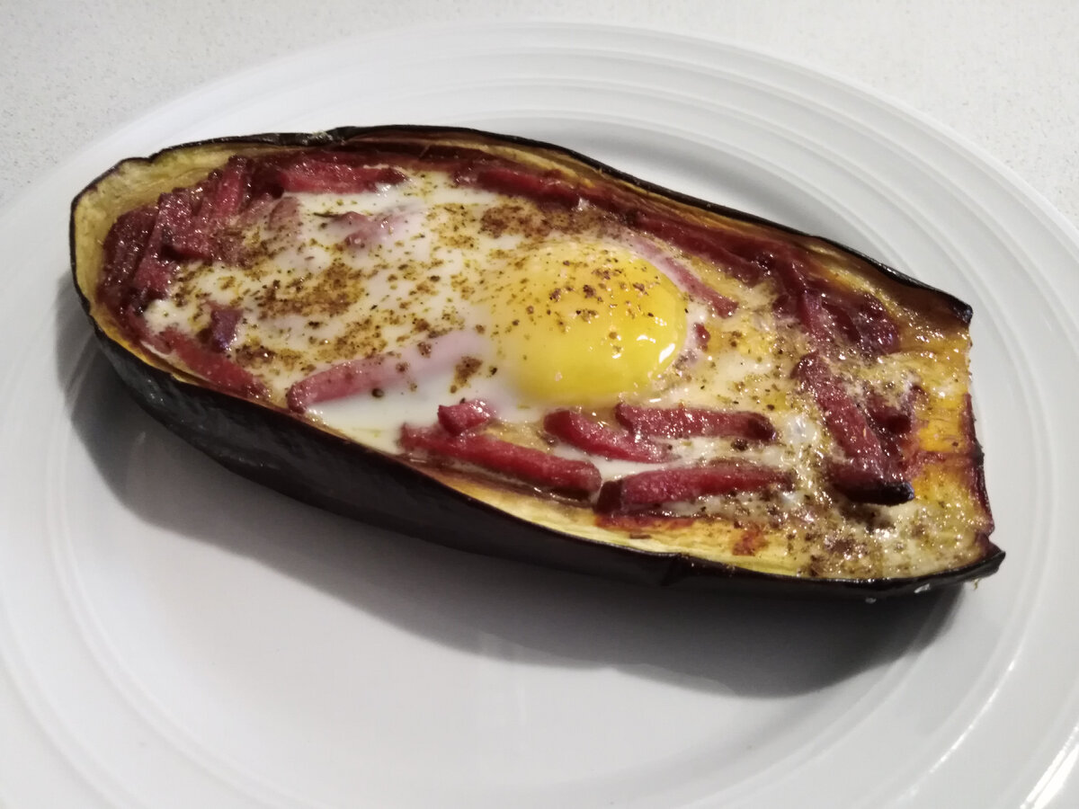 Готовлю яичницу в баклажановых "ладошках", запечённых с копченостями