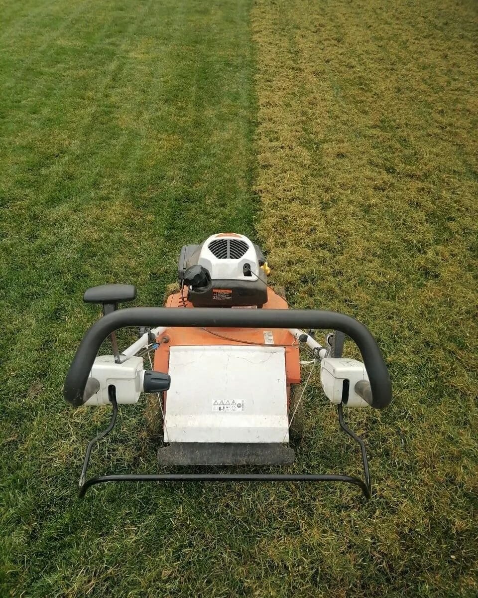 После этого делается скарификация - вычесывание войлока и мёртвой травы скопившейся за зиму.