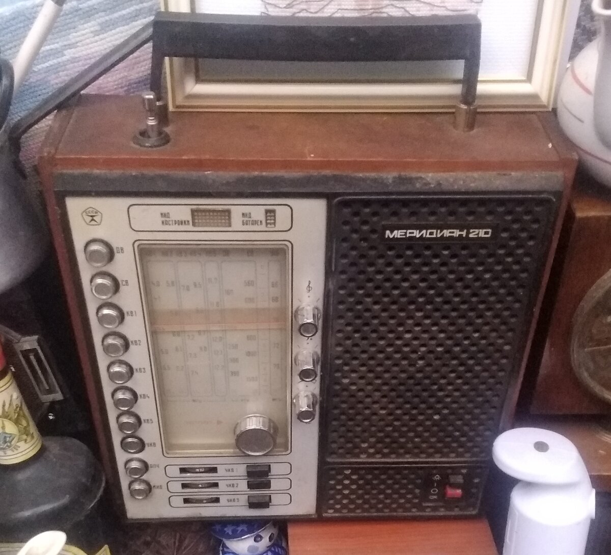 Добрый день, дорогие друзья Несмотря ни на что, жизнь на барахолке продолжается, и даже цены практически не изменились. Как всегда, по традиции наш сегодняшний обзор с барахолки начнем с радиоприемников. Первым у нас будет переносной радиоприёмник второго класса Меридиан-210, приемник немного грязный, но техническое и внешнее состояние хорошие. Радиоприёмники "Меридиан-210" с 1977 года выпускал Киевский завод "Радиоприбор". Продавец просил за него 500 руб, и готов был к торгу. Еще один радиоприемник за такую цену – Россия. Состояние на 4. Довольно редкий портативный радиоприёмник Хазар-304, выпускался Бакинским радиозаводом. Питание осуществляется от шести элементов типа А343 или двух батарей 3336Л. Имеется возможность подключения внешней антенны, головных телефонов и внешнего источника питания. Технические характеристики: - Чувствительность в диапазоне ДВ - 2, СВ - 1,5 мВ/м. - Селективность по соседнему каналу - 30 дБ. - Номинальная выходная мощность - 300, максимальная - 500 мВт. -