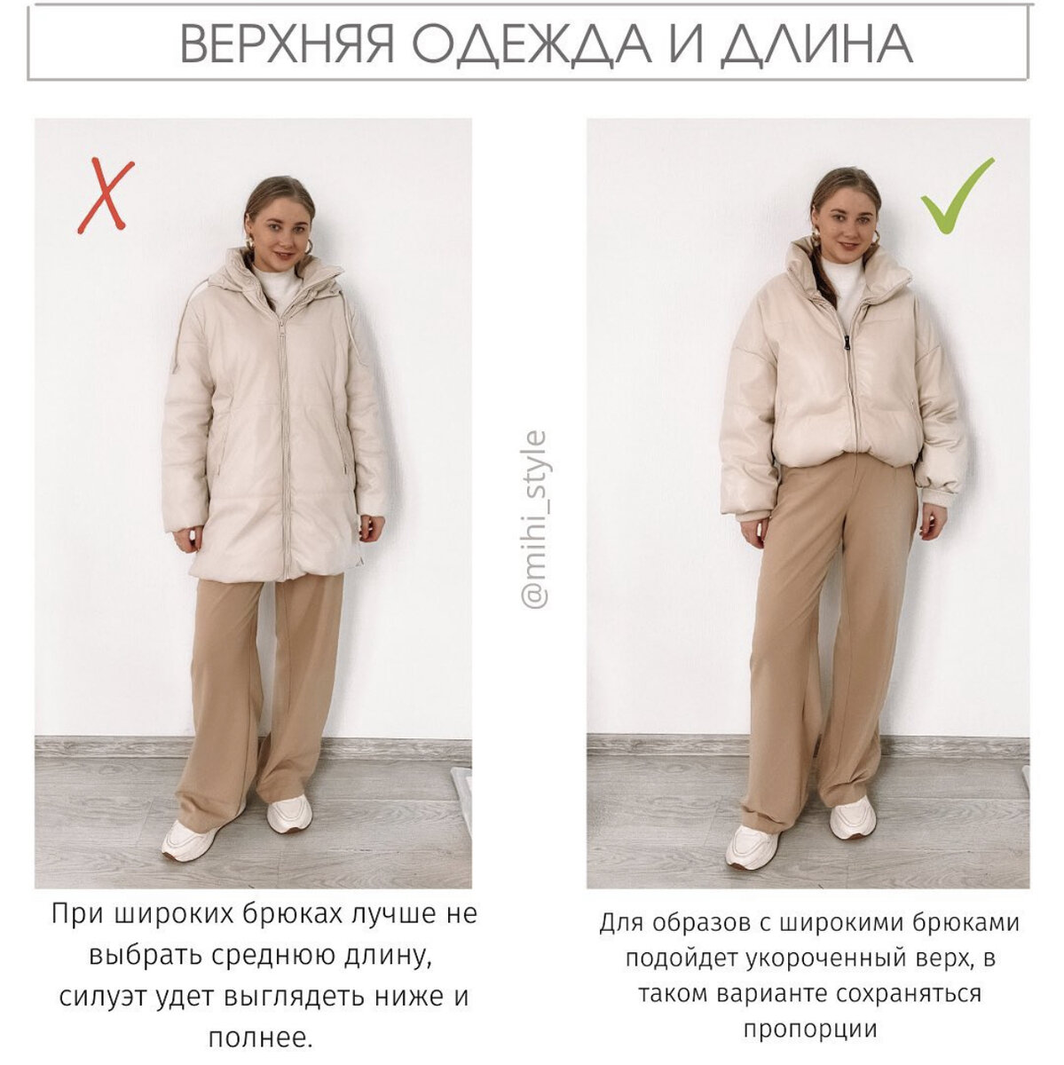 Как сочетать верхнюю одежду и кому какая длина подходит? . ❗️Не теряйте меня и подписываетесь на телеграм канал ( ссылка в шапке профиля) или по поиску mihi_style_channel❗️ . . 🌟Короткий пуховик - для любого роста, удлиняет ноги, может перегрузить верхнюю зону, не рекомендуется грушам или полному яблоку. 🌟Удлинённый пуховик - только для высокого роста и длинных ног. Такая длина пуховика позволяет надевать только брюки, с юбками такая длина не пропорциональна. 🌟Пуховик до колена или чуть ниже колена- хорошая длина для невысокого роста, будет пропорциональна для брюк и юбок, сохранит пропорции. 🌟Пуховик чуть выше щиколоток - подходит для высокого роста, хорошо вытягивает силуэт, но не подойдёт для низкого роста, так как перегрузит силуэт. Такая длина подойдёт для образов с юбками и брюками! . . Широкие брюки ✅ короткий пуховик 💡Удлиненный пуховик ( утяжелит силуэт) ✅Пуховик до колена( не рекомендуется при низком росте) 💡Длина чуть выше щиколоток ( только для высокого роста) . . З