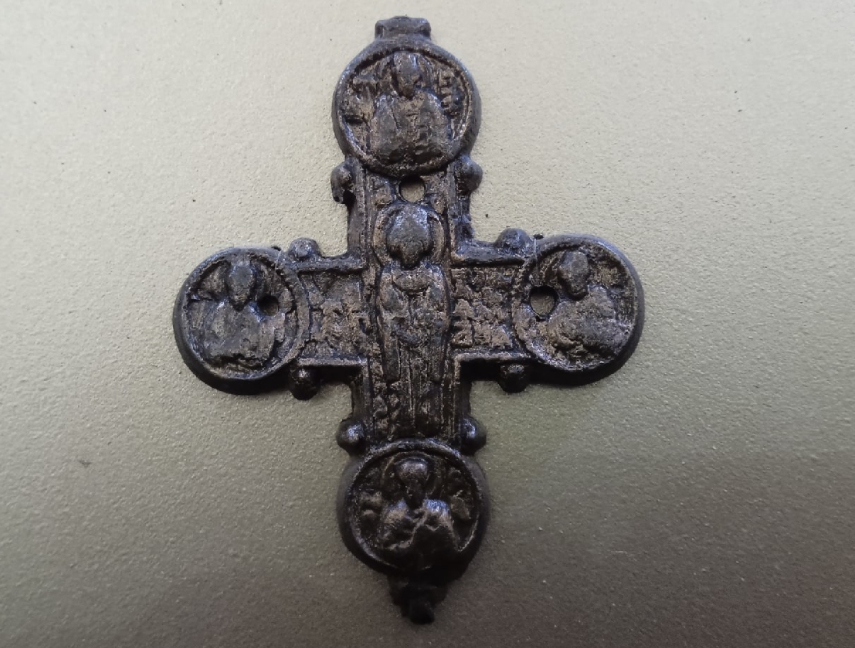 Энколпион. Точнее, верхняя половинка от него, без навершия и ушек для крепления. Он же - крест-мощевик, своего рода ковчежец, имеющий внутри полость. Туда клали фрагменты мощей святых, кусочки их одежды и так далее.
