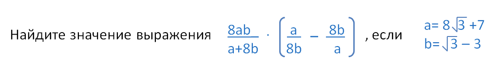 Если раньше в задании 8 проверялось умение работать со свойствами корней и степеней, то в этом году сюда включены любые задания, в которых необходимо найти значение алгебраического выражения. Т.е. проверяются не только навыки счета, но и умение упрощать выражения. А с этим у многих школьников действительно не очень хорошо 😢 Что нужно для исправления этой ситуации? ✅ Во-первых, повторить правила сложения, умножения и деления обыкновенных дробей и дробных выражений. ✅ Во-вторых, научиться раскладывать на множители выражения с помощью формул сокращенного умножения и вынесением общего множителя. Посмотрим одно задание 8 на примере, взятого с просторов "РешуОГЭ". Подставлять значения a и b в само выражение нет смысла. Для начала упростим само выражение. Первым действием найдем разность двух дробей (действие в скобках). Приведем дроби к общему знаменателю 8ab. Вторым действием находим произведение. Заметим, что числитель второй дроби можно разложить на множители по формуле "разност