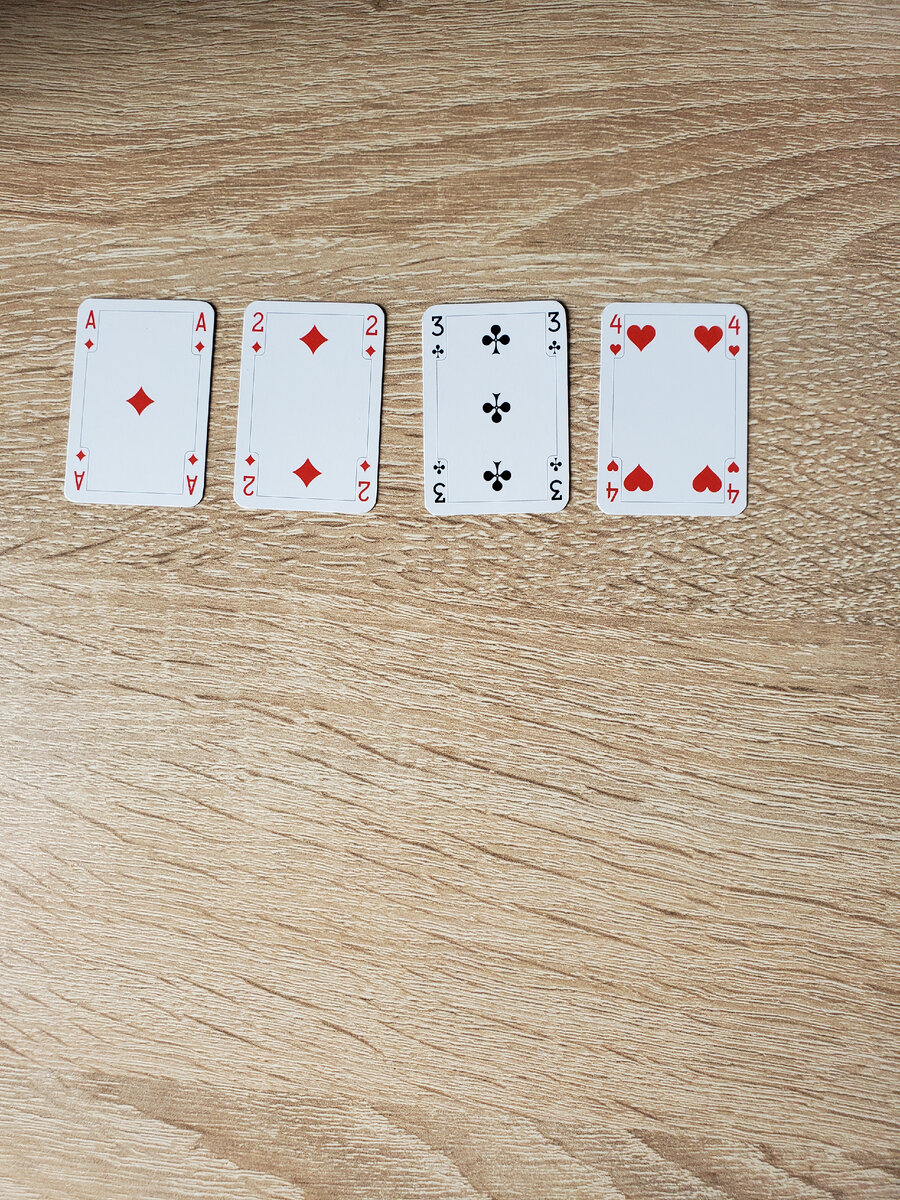Другое название, которое может встречаться "Урок арифметики". Из колоды в 52 карты выкладываем на стол в ряд Т, 2, 3, 4. Масть карт значение не имеет. Оставшиеся карты тщательно перемешиваем. Перелистываем колоду по одной карте. На выложенные (базовые) карты кладем те карты, которые по очкам больше предыдущей в колонке базовых карт на стоимость базовой карты. Карты от 2 до 10 соответствуют по очкам своему номиналу, Т - 1, В - 11, Д - 12, К - 13. На туза кладем двойку, на двойку - четверку, на тройку - шестерку, на четверку - восьмерку. С базовым тузом все в порядке. На нем будет возрастающая последовательность карт от Т до К. Тут сложностей нет. А вот с остальными базовыми...тут придется вести подсчет. Например, на базовой 2 будет последовательность: 4, 6, 8, 10, Д... А дальше? Дама - это 12 очков. Значит, к 12 прибавляем 2 (стоимость базовой карты). Получается 14. Но сумме 14 никакая карта не соответствует. Если сумма выходит больше 13, то из нее нужно вычесть 13. Из 14 вычитаем 13.