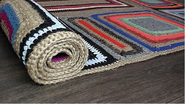Ковёр вязаный крючком, из остатков пряжи разной толщины и фактуры, такой как шерсть, акрил, хлопок, микрофибра и многое другое.