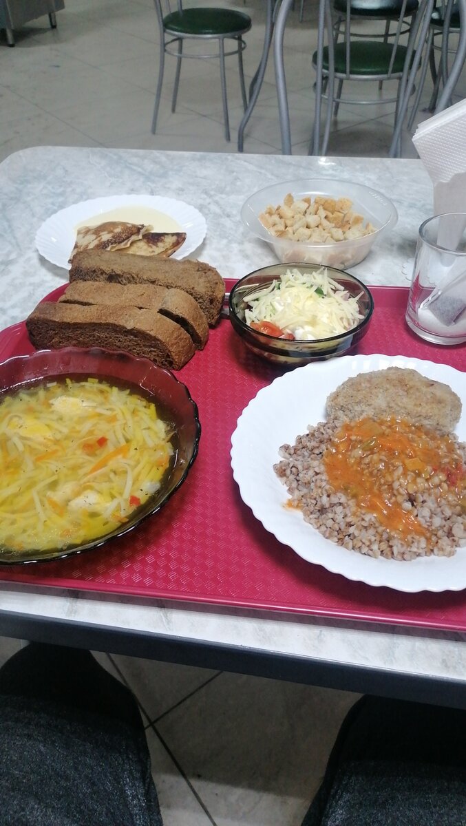 Всем огромный мартовский привет! 🤗 У нас сегодня снова выпал снег🙉 Весь февраль лил дождь, а в марте снег. Супер 👍😄 Всё согласно женской логике, как положено)) Но пост не об этом На днях муж обедал в придорожном кафе г. Ачинска Красноярского края. Прислал данное фото👇 Я всё внимательно изучила. Ну на вид аппетитно выглядит. Что входило в обед: куриный суп-лапша, гречка с подливкой и котлетой, салат из ветчины, сыра и свежих овощей, блины со сгущенкой, хлеб ржаной плюс сухарики и чай с сахаром. Неплохой наборчик, да? 😉 Стоимость такого обеда всего 354 рубля. По последним меркам это оооочень дёшево. Обычно меньше 500 рублей сейчас обед не стоит в подобных кафе. Спрашиваю мужа: "Вкусно хоть? Или так, чисто желудок набить?" - Нет, вкусно, - говорит. Даже очень. И всё свежее, сразу чувствуется. Он уж у меня спец по таким заведениям😄 К сожалению, названия этого кафе не знаю, но ставлю большой ➕ ему и всем работникам👍, благодаря отзыву моего мужа. Чувствую себя сейчас каким-то