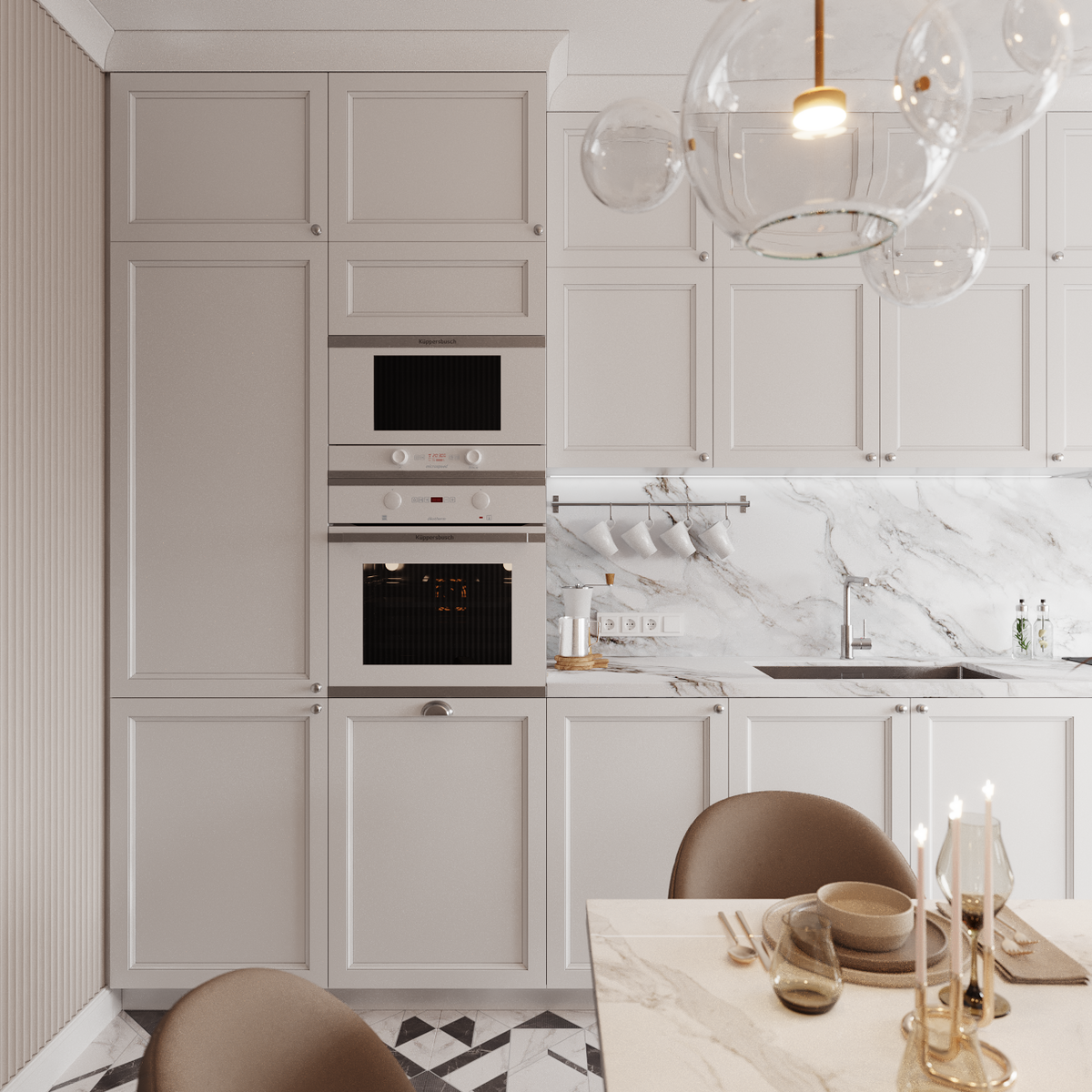 Вот несколько пунктов, которые помогут в этом вопросе: 1. Выбирайте кухню (кухонный гарнитур) в натуральных оттенках. Избегайте ярких навязчивых цветов! Это может быть дерево, оттенки серого или бежевого, а так же просто белый цвет. Допустимо сочетание матового чёрного с каким-то светлым оттенком в общей композиции, или нечто подобное. Красный, зелёный, жёлтый и что там ещё было модно лет 15 назад - исключаем! Яркие цвета имеют свойство быстро надоедать, это нужно учитывать при выборе кухни. Никаких лаковых глянцевых фасадов - подобные решения в сейчас выглядят колхозно откровенно устаревшими - это во-первых, а во-вторых, глянец не слишком практичен в повседневном использовании! И ещё: всё вышесказанное относится также к столовой мебели! 2. Обои - нет. Никаких обоев в интерьере кухни! Для стен стоит ограничиться обычной покраской. При выборе цвета следует отталкиваться от основного цвета кухонного гарнитура, т.к. он является ключевым элементом интерьера и центром притяжения взгляда
