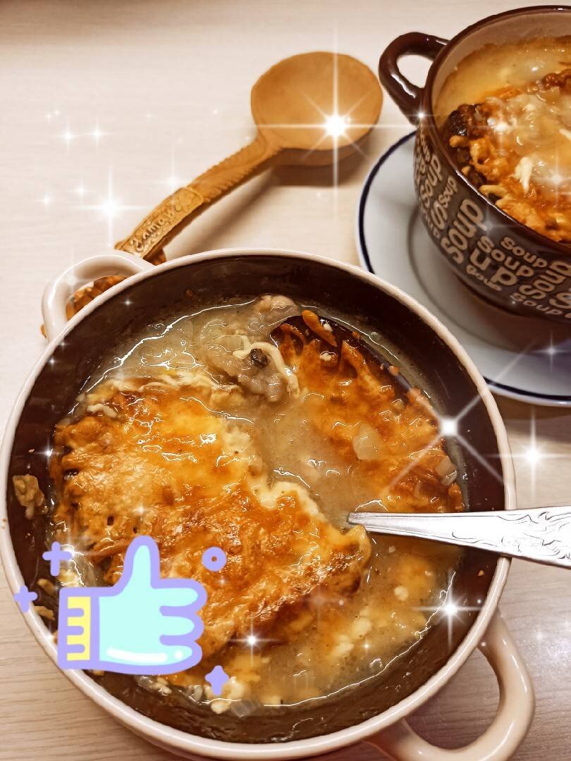 Простое блюдо этот французский луковый суп. Готовится из самых известных продуктов, лука и сыра. #рецептбодрости Ингредиенты: крупные луковицы, бульон мясной/овощной, Пряности, Сыр твёрдых сортов, чеснока, Соль/перец, Сливочного масла, Растительного масла, хлеба, муки Способ приготовления: Подготовить продукты. Лук нарезать тонкими полукольцами или четверть кольцами. Сварить бульон. Процедить его. В сотейнике растопить масло. Закладываем в масло лук и доводим его до прозрачности. Добавить муку к луку. Перемешать. Влить бульон. Положить пряности и варить 20 минут. На сухой сковороде обжарить хлеб. Натереть его чесноком. Разлить суп в горшочки/чашки для запекания. Уложить сверху кусочки хлеба. Сверху посыпать тёртым сыром. Поставить в духовку минут на 10-15 запекать. При Т-180*С. Очень вкусно😋👍, сытно и просто😁