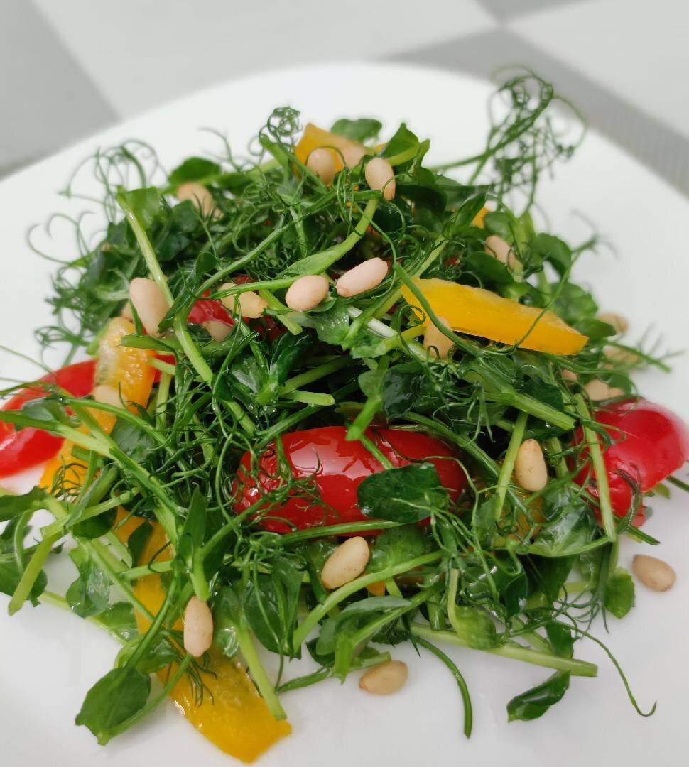 Микрозелень сейчас можно без проблем купить в магазине. Такой салат можно добавлять в разные блюда, можно использовать в качестве брускетты или вторых блюд ВКУСНО. ПРОСТО. ЛЕГКО ❤️ #пост Ингредиенты: микрозелени, помидор черри, свежего перца, оливкового масла, соевого соуса, Для украшения, кедровых орешек Способ приготовления: Приготовить все ингредиенты: помыть и просушить. Порезать помидоры, перец, и добавить микрозелень. Оливковое масло соединить с соевым соусом, перемешать и заправить наш салатик. Заправку можете сделать по своему вкусу❤️ Вкусный, красивый и полезный салатик готов 🥗 Радуйте своих родных ❤️ готовьте с Любовью ❤️