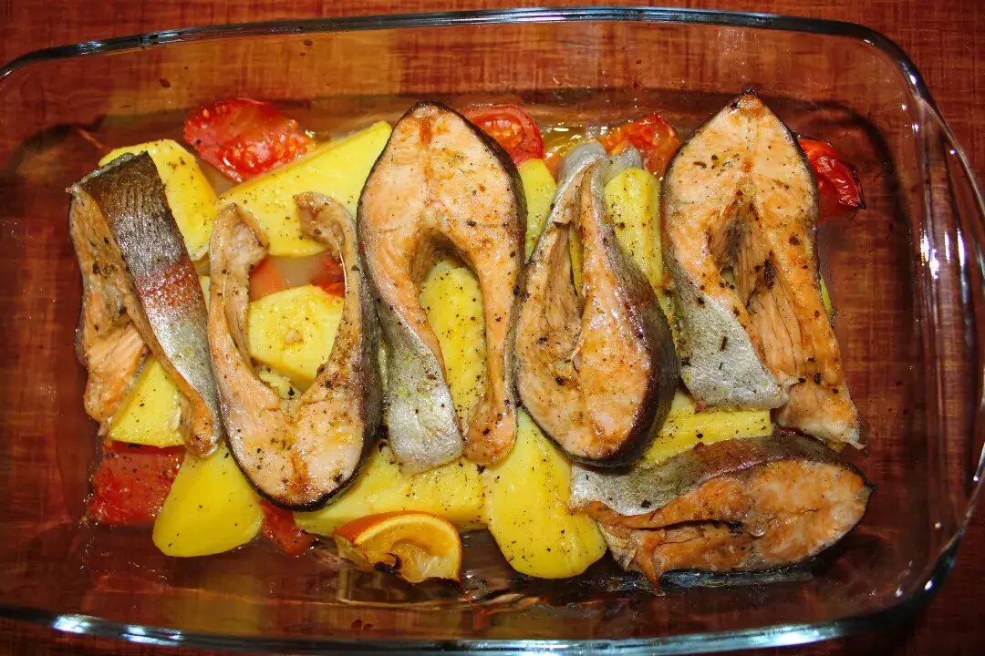 Благодарю за рецепт @cookkishmish . Готовила по Вашему рецепту. Получилось очень вкусно! Идеально для постное меню! #готовимслюбовью #готовимдома #едаташкент #едаузбекистана #можновпост #постныерецепты #постныеблюда #краснаярыбавдуховке #рыба #рыбавдуховке #запеченаярыба #рыбасовощами #рыбасовощамивдуховке #пост #постнаяеда Ингредиенты: Красная рыба, Картофель, Морковь, Помидоры, Лимон, Перец душистый, Лимонный перец, Приправа для рыбы, Соль по вкусу, Масло оливковое Способ приготовления: Подготовим все ингредиенты Картофель нарезать дольками и отварить. В оливковое масло добавить соль и специи. Перемешать и обмазать кусочки рыбы. Помидоры нарезать дольками. Если черри, то пополам. Морковь нарезать тонкими слайсами. В форму с высокими краями выложить овощи. Посолить и поперчить. На овощи выложить кусочки рыбы. Сбрызнуть лимонным соком. Остатки лимона я тоже добавила запекаться. Форму накрыть крышкой или фольгой. Запекать в предварительно разогретой духовке 30-35минут при температуре 17