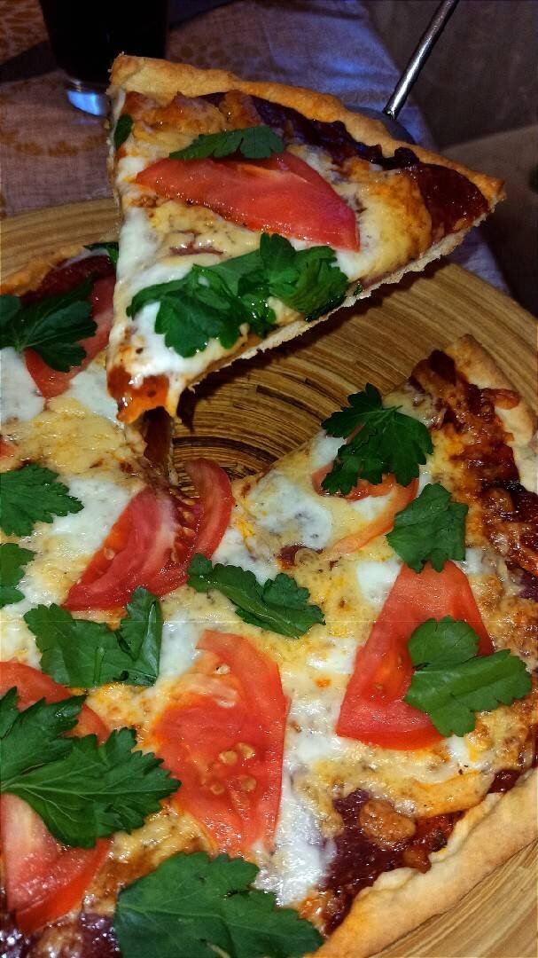 Ингредиенты: Готовое тесто для пиццы, Моцарелла, Сыр российский, Помидор, Лук репчатый, Томатная паста, Базилик свежий или сушёный, Пепперони или другая копчёная колбаса, Мука для присыпки, Сахар пару ложек, соль по вкусу и масло растительное для жарки Способ приготовления: Тесто готовое разморозить Пока тесто размораживается, готовим соус для пиццы. Нарезаем мелкими кубиками лук, обжариваем на сковороде, когда лук приобрел золотистый цвет слегла, добавляем томатную пасту и пару минут прогреваем ее вместе с луком, размешивая. Добавляем немножко водички и базилик. Также добавляем сахар, чтоб соус не был кислым, убавляем огонь, накрываем крышкой и тушим минут 7. Колбаса у нас была нарезка, поэтому порезали только помидоры и моцареллу, а второй сыр измельчили на тёрке. Раскатываем тесто тонко, в круг, делаем бортики, присыпаем противень мукой, выкладываем пиццу и ставим в разогретую духовку 200 градусов буквально на 5 мин, чтоб тесто немного схватилось. Далее достаем заготовку пиццы, выкл