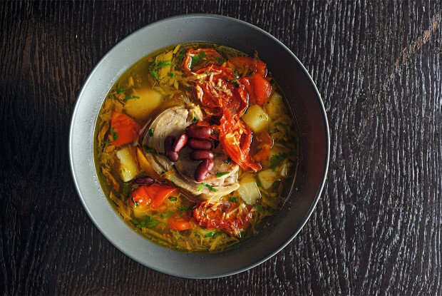 Суп с рулькой 4 2 ЧАСА ДОБАВИТЬ В КНИГУ РЕЦЕПТОВ3 10 АВТОР РЕЦЕПТА АВТОР: НИКА ГАНИЧ69 РЕЦЕПТОВ ПОДПИСАТЬСЯ Рецепт из тульского ресторана-пивоварни «Августин». Его шеф Евгений Тимофеев преобразовал типичную пивную закуску — свиную рульку — в отличный наваристый суп, которым можно и закусывать, и поправлять здоровье после выпитого. Рецептом с нами поделилась Ника Ганич, автор книги «География на вкус с Никой Ганич. Тула». ЭНЕРГЕТИЧЕСКАЯ ЦЕННОСТЬ НА ПОРЦИЮ КАЛОРИЙНОСТЬ БЕЛКИ ЖИРЫ УГЛЕВОДЫ 779 47 53 31 ККАЛ ГРАММ ГРАММ ГРАММ * КАЛОРИЙНОСТЬ РАССЧИТАНА ДЛЯ СЫРЫХ ПРОДУКТОВ ИНГРЕДИЕНТЫ ПОРЦИИ 4 820 гСвиная рулька 60 млСветлое пиво 40 гМед 25 млСоевый соус 480 млКуриный бульон 20 гЛук-порей 20 гСладкий перец 40 гМорковь 200 гКартофель 1 головкаЧеснок 60 гВяленые помидоры 40 гКрасная фасоль 8 гПетрушка по вкусуСоль по вкусуМолотый черный перец 20 гДижонская горчица ИНСТРУКЦИЯ ПРИГОТОВЛЕНИЯ 2 ЧАСА РАСПЕЧАТАТЬ 1Из рульки удалить кость. Мясо посолить, поперчить и свернуть рулетом. Смазать смесью и