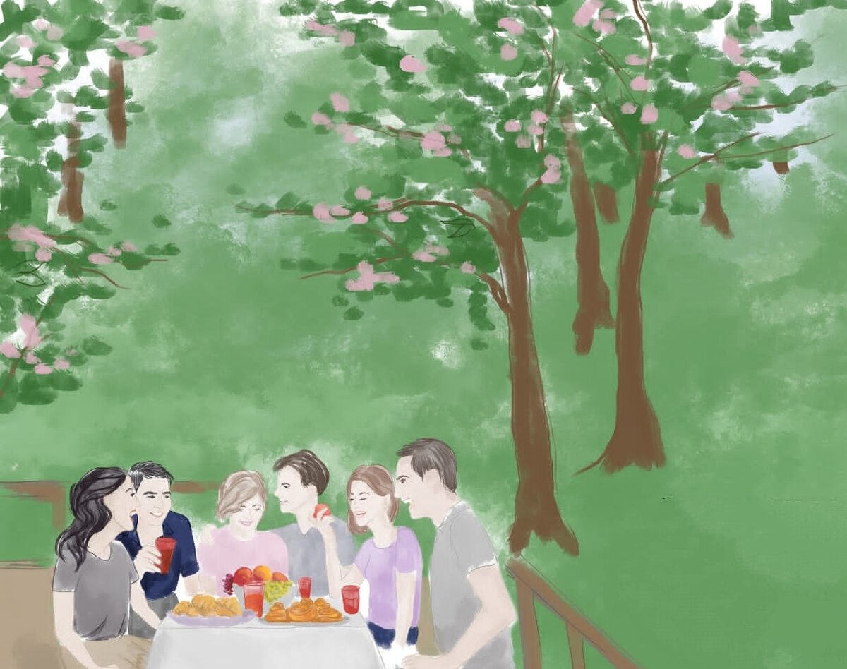 Два часа спустя, глядя на компанию красивых людей за столом на веранде деревянного дома в цветущем майском саду, одинокий сосед сказал самому себе: "Когда любовь включает цвет, всё начинается с семьи."