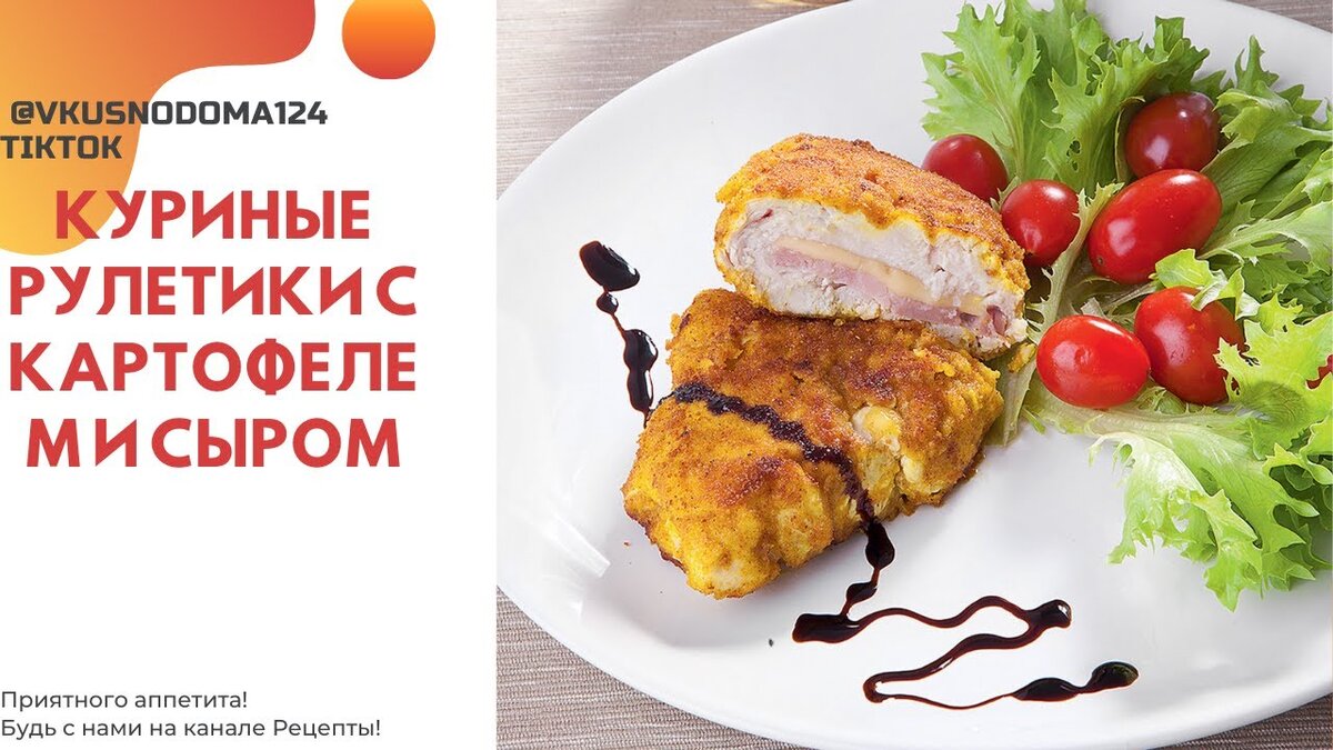 Количество ингредиентов зависит от того, сколько рулетиков тебе нужно. На каждый у меня ушло по 2 кусочка сыра и 1 чайной ложке картофельного пюре. Ингредиенты: Куриное филе 700 гр; Сыр 150-200 гр; Картофельное пюре ~150 гр; Паприка, приправы по вкусу; Соль, перец. Приготовление: 1. Отварить картофель и сделать пюре. Я добавила молока и сливочного масла, не делай слишком жидким, пусть лучше будет погуще 2. Куриное филе нарезать вдоль на тонкие пласты и хорошо отбить. 3. На каждый пласт положить 2 ломтика сыра, сверху чайную ложку пюре, можно добавить приправу. Завернуть в рулет. 4. Обжарить на разогретой сковороде со всех сторон до золотистой корочки. Всё готово. Приятного аппетита! Рецепты - кулинарный канал. ★Видео популярных рецептов. ★Завтрак, обед и ужин - все здесь. Заходите, смотрите и подписывайтесь на канал! Мы в интернете: ➧ Tik Tok - https://www.tiktok.com/@vkusnodoma124 ➧ Instagram - https://www.instagram.com/vkusnodoma124/ ➧ Почта - vahima1966@mail.
