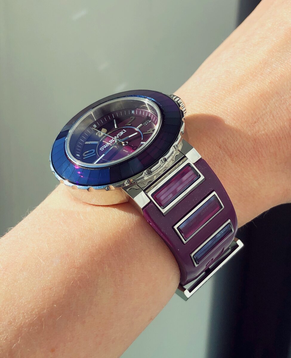 Всем привет, кто читает мой отзыв! Речь пойдёт о часах Swarovski Womens Quartz with Silver. Специальный выпуск популярных часов от Swarovski. В фиолетовом цвете. Часики конечно ну очень хорошенькие, аккуратные, стильные. Такой можно сказать полу спортивный стиль. Сами часики выполнены из нержавеющей стали, покрытие серебро Размер корпуса: 39 мм Длина ремешка часов: 19 см Материал: Кристаллы Страна производства: Швейцария Материал ремешка:каучук Сделано в: Швейцария Часовой механизм: Кварцевый. Циферблат сапфировое стекло. Данная модель может соответственно отличаться от других аналогичных моделей. Стоимость часов примерно, точно не помню, так как были куплены часы заграницей несколько лет тому назад 32.000 тыс. рублей. Вообщем рада приобретению данных часов, для разнообразия, для коллекции .