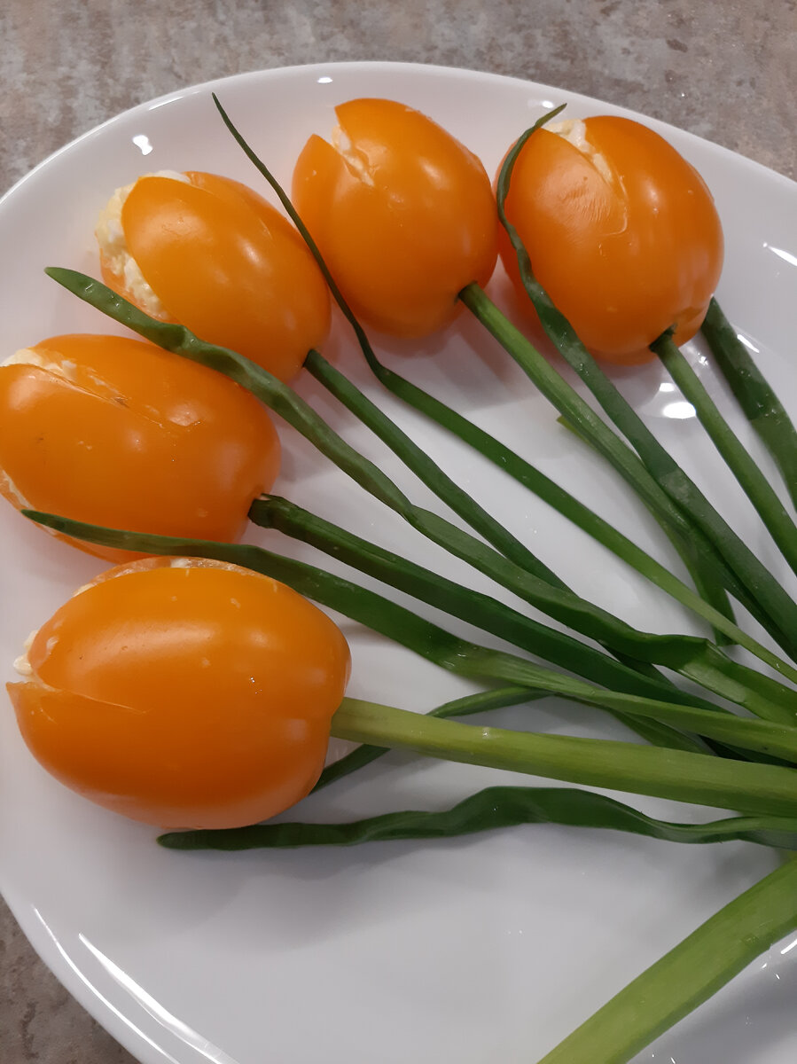 Всем привет! Это @prostogotovka - простые и вкусные рецепты, для тех, кому лень готовить. Закуска из помидоров в виде тюльпанов – одна из самых популярных закусок к 8 марта.Готовится закуска «Тюльпаны» невероятно просто и станет достойным украшением праздничного стола. #закуски на праздник #закуска ИНГРЕДИЕНТЫ: Помидоры сорта «Сливки» — 5 шт. Яйцо — 1 шт. Сыр твердый (можно плавленый) — 100 гр. Майонез — 1 – 2 ст. ложки. Лук зеленый — 1 пучок. Чеснок — 1 - 2 зубчика. ПРИГОТОВЛЕНИЕ: Помидора помыть. Яйцо отварить. На помидорах сделать крестообразные надрезы, чайной ложкой очень аккуратно вынуть мякоть. Вареное яйцо, сыр натереть на крупной терке. Смешать яйцо, сырок и измельченный чеснок. Заправить всё майонезом, перемешать до однородной массы. Наполнить подготовленной начинкой помидоры. В деревянные шпажки просунуть в перья зеленого лука. Это будут ножки тюльпанов. Вставить ножки тюльпанов в «бутоны». Выложить на большую тарелку в виде букета, украсить оставшимися перьями лука. ПРИЯТ